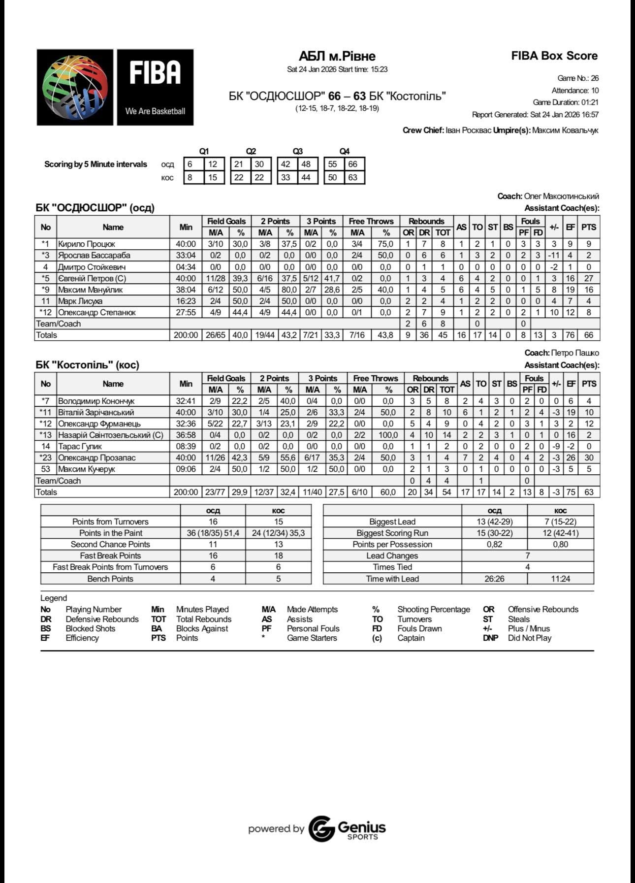 Ключовою стала заключна чверть, у якій команда «Сарни» повністю змінила хід матчу, вигравши відрізок із рахунком 26:7. Саме цей ривок дозволив дотиснути суперника та здобути важливу виїзну перемогу.