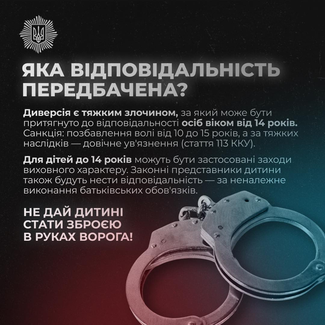 ❕Однак, важливо пам’ятати, що диверсія – тяжкий злочин, за який передбачена кримінальна відповідальність. У разі тяжких наслідків можливе навіть довічне ув’язнення.