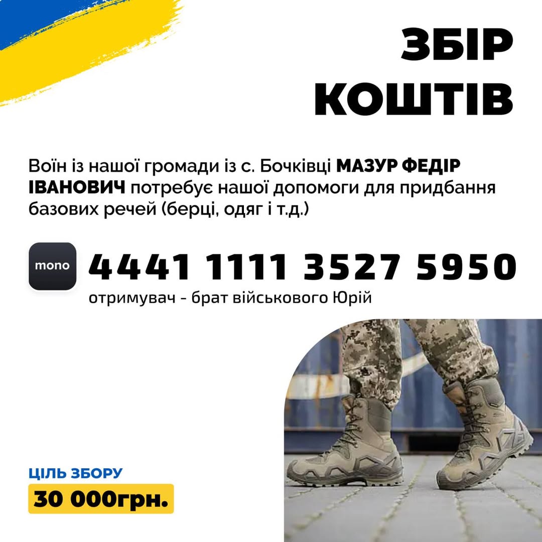 Воїн із нашої громади із с. Бочківці Мазур Федір Іванович потребує нашої допомоги для придбання базових речей (берці, одяг і т.д.)