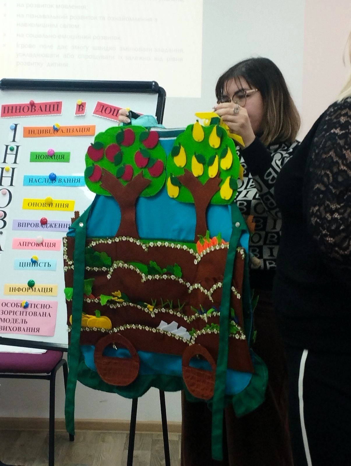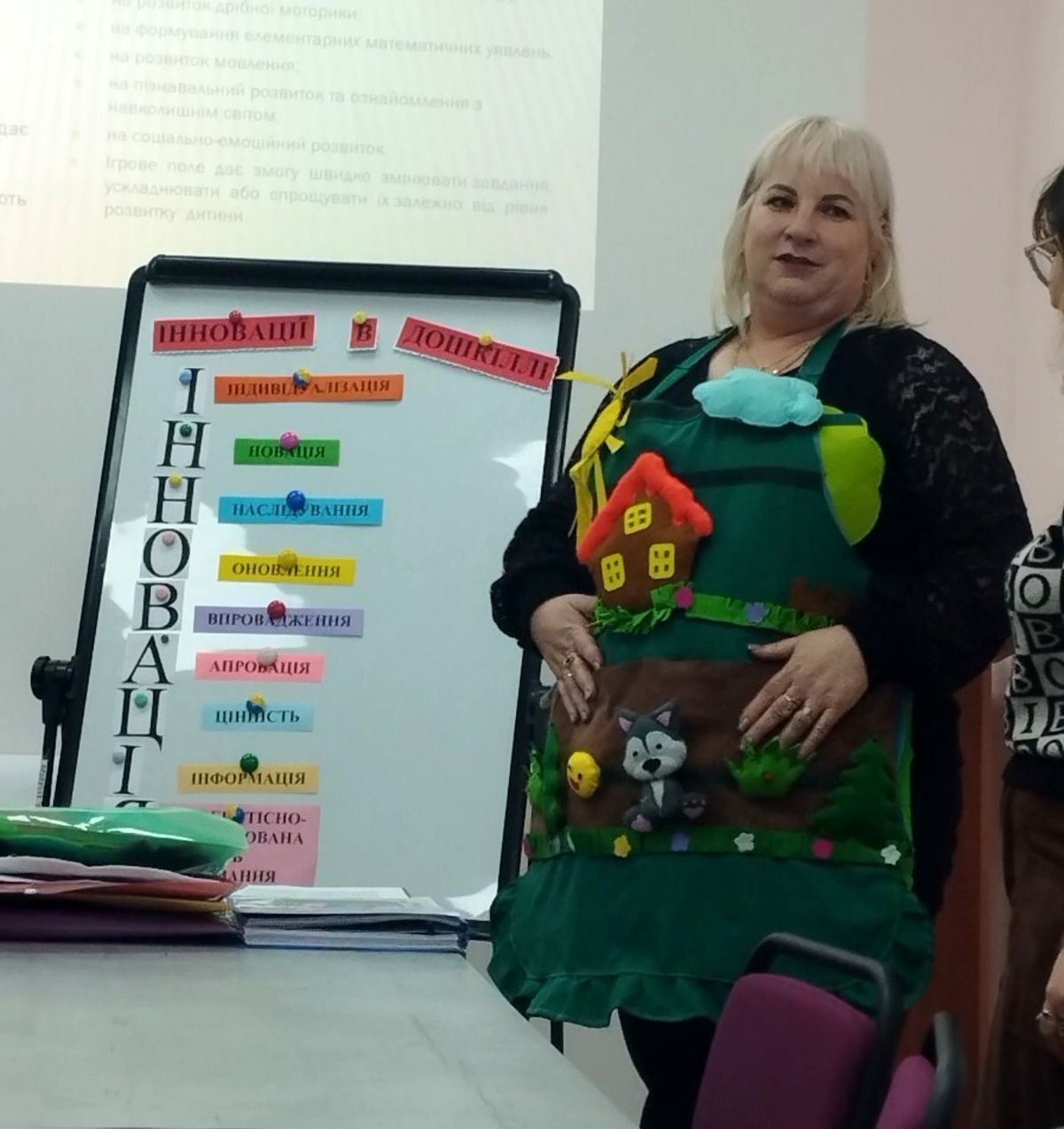 Досвідом роботи з впровадження в практику роботи сучасних інноваційних методик поділилася Сніжана Волкова, вихователь ЗДО №4 «Веселка». Вихователь своїми руками створила цікавий посібник «Театр на фартусі», який дає змогу в нестандартній формі вирішувати багато питань щодо формування у вихованців знань про колір, величину, форму, розвиток мовлення, ознайомлення з навколишнім світом та інші завдання розвитку дитини. Педагог розробила паспорт посібника, методичні рекомендації. Надала практичні матеріали та поради з виготовлення та використання представленого посібника.