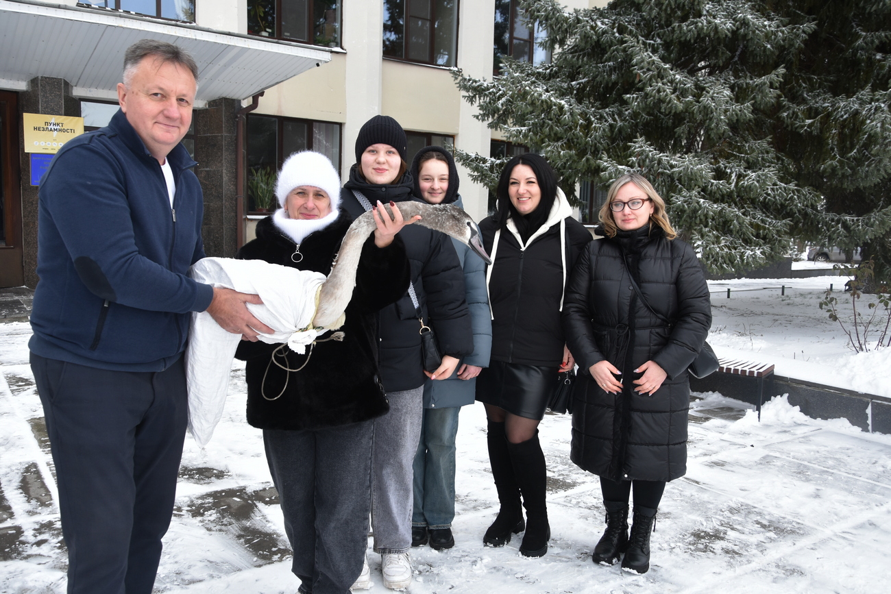 Нових тимчасових господарів для лебедя знайшли швидко. Птаха забрала директорка Риботинського НВК Наталія Хотинченко разом із вчителями та дітьми. Наразі лебідь житиме на території навчального закладу.