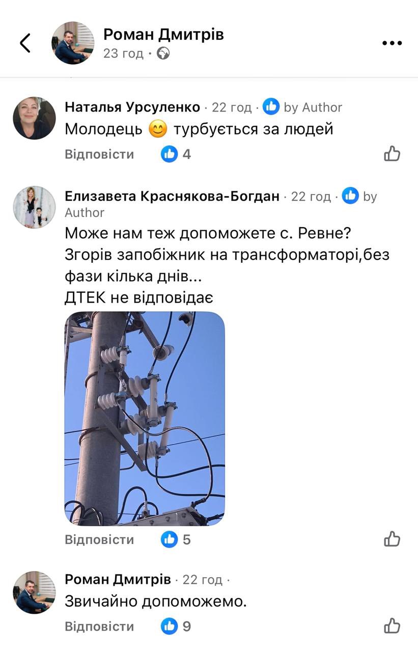 Вчора отримав звернення від мешканки Ревного про допомогу відремонтувати ТП 1585. (Скрін на фото).