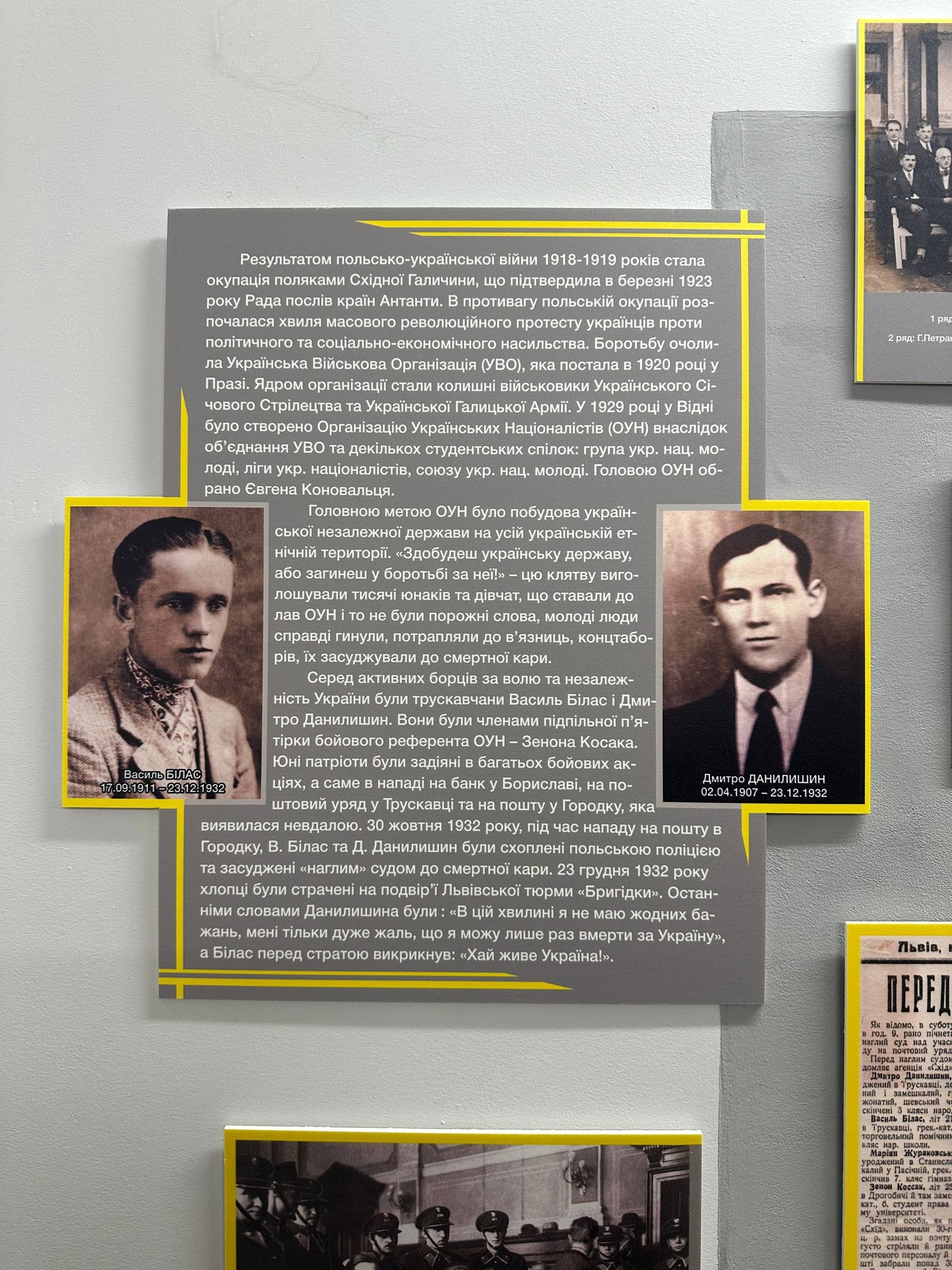 23 грудня – сумні 93 роковини страти трускавчан, членів ОУН Василя Біласа та Дмитра Данилишина. Вони мали відвагу протистояти тодішній Польській державі, ставши на захист інтересів української нації. Засуджені до страти через повішення, вони стали Героями для всіх українців. У день їхньої страти жалібно били церковні дзвони, а люди згадували їхній подвиг.
