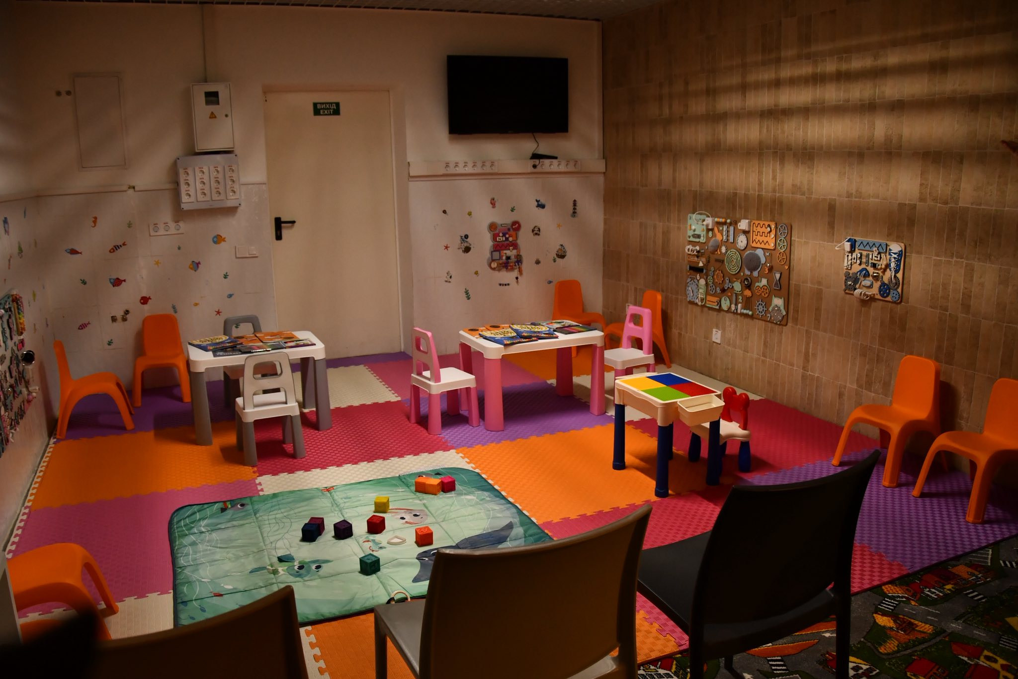 Пункт на –1 поверсі продовжує свою роботу під час повітряної тривоги та виконує також функцію повноцінного укриття. Є простір, адаптований для дітей, з м’яким підлоговим покриттям та бізібордами. На 1 поверсі облаштовано також простір з диванами та столами, тут же можна підзарядити гаджети.