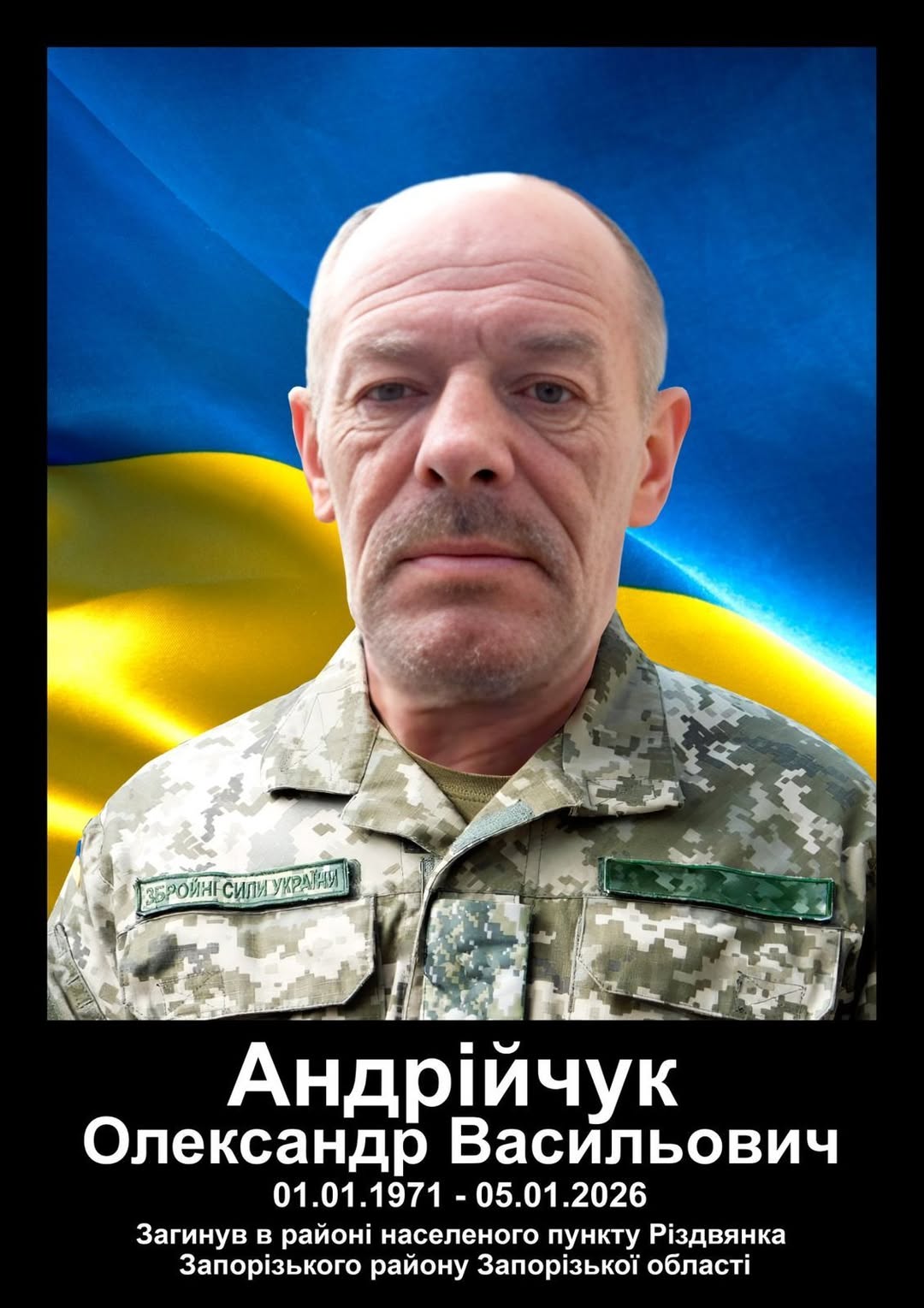 05 січня 2026 під час ведення бойових дій у районі населеного пункту Різдвянка Запорізької області, загинув наш воїн Олександр Андрійчук, житель с. Решуцьк.