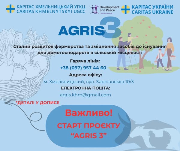 Проєкт #AGRIS3 реалізується Карітас Хмельницький УГКЦ у партнерстві з Caritas Ukraine за фінансової підтримки The Canadian Catholic Organization for Development and Peace (Development and Peace – Caritas Canada ).