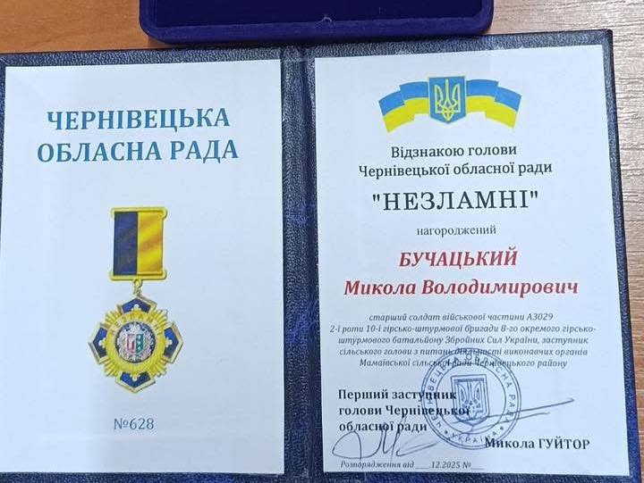🔸Почесну нагороду особисто вручив перший заступник голови Чернівецької обласної ради Микола Гуйтор — за мужність, відданість Україні та сумлінну службу у лавах Збройних Сил України.