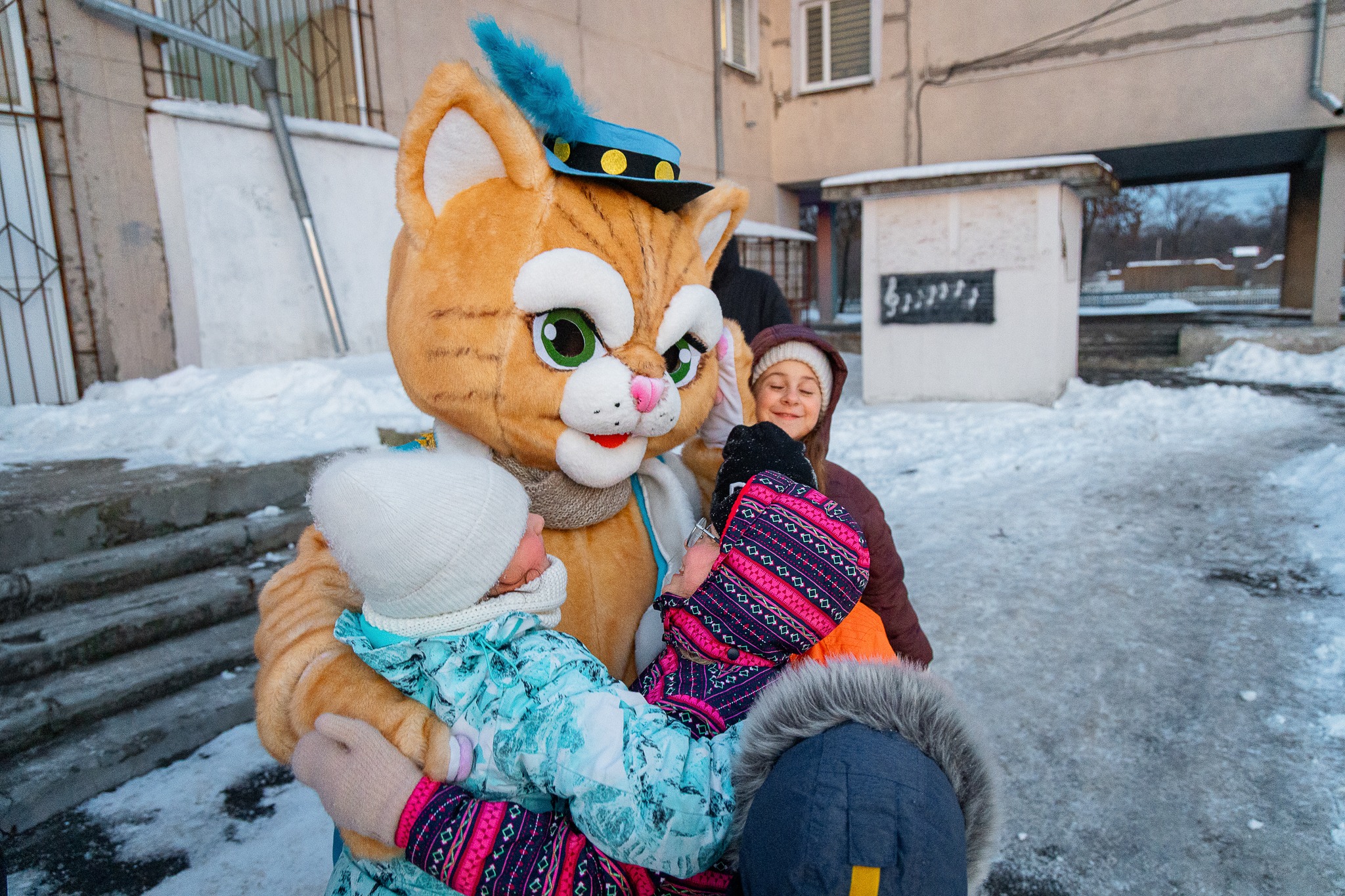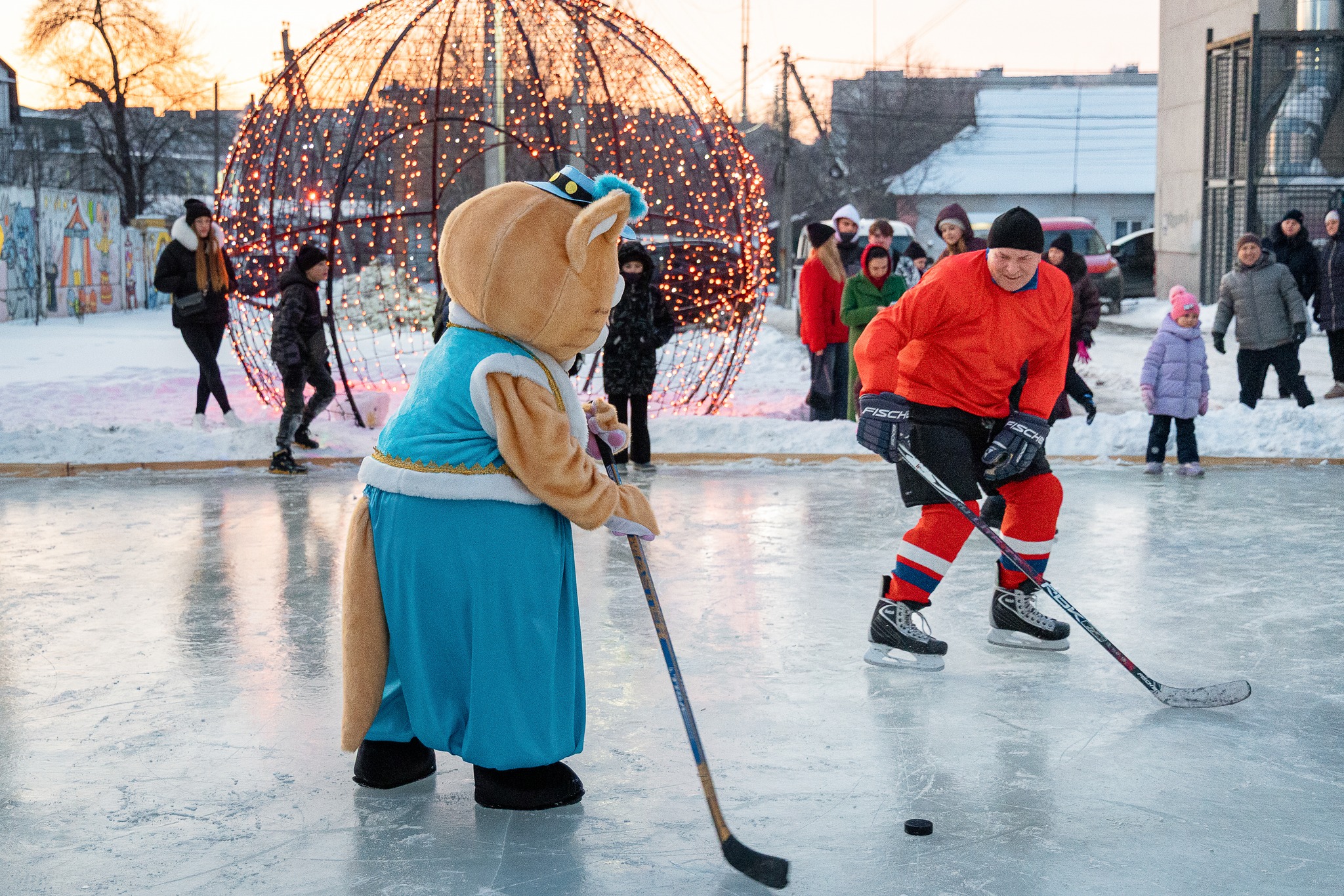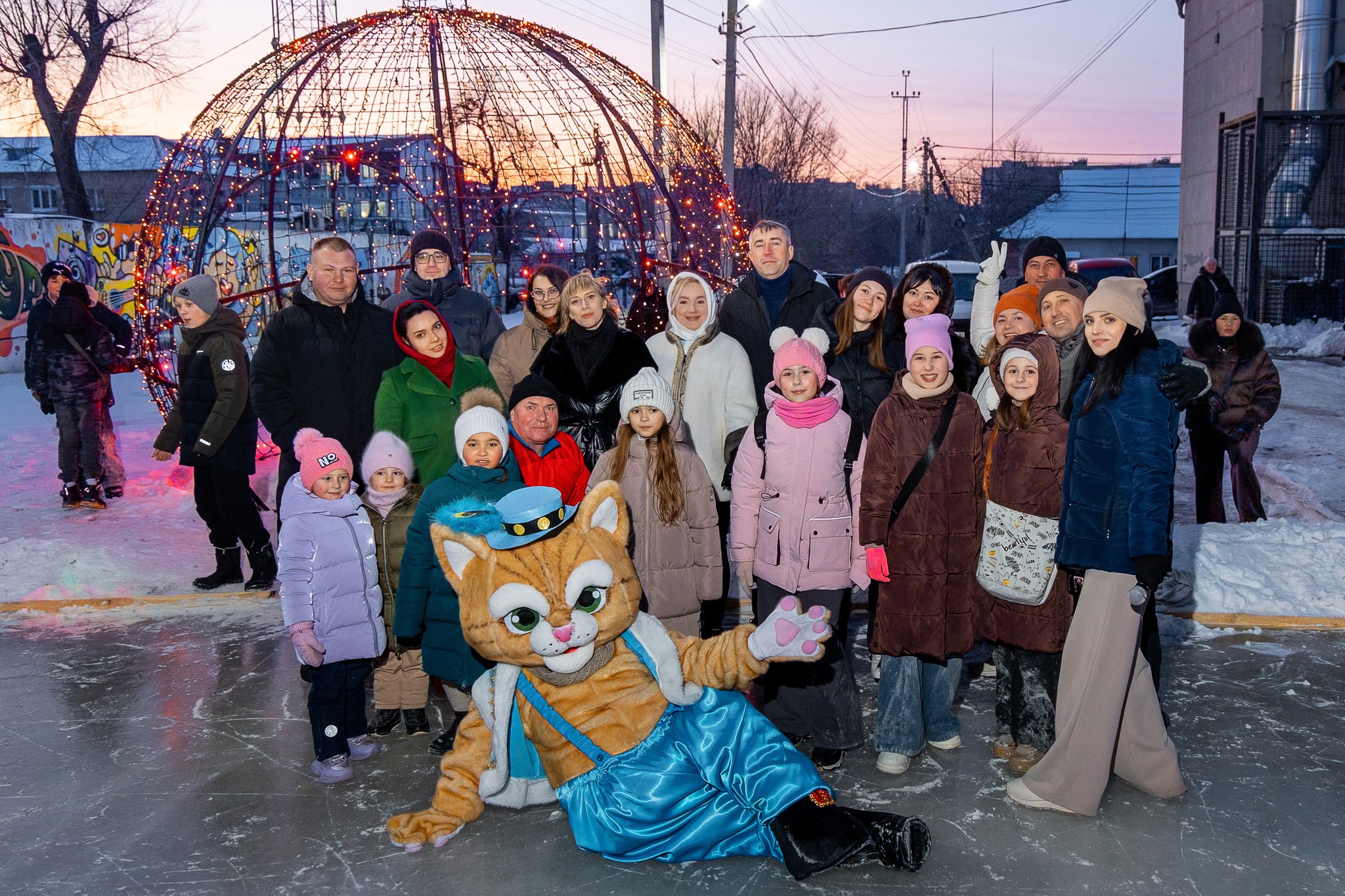 Першими на лід вийшли казкові персонажі: 🐱Пан Коцький та слобожанський хокеїст Гуржик, які у жартівливій формі продемонстрували можливості ковзанки та створили святковий настрій для відвідувачів.