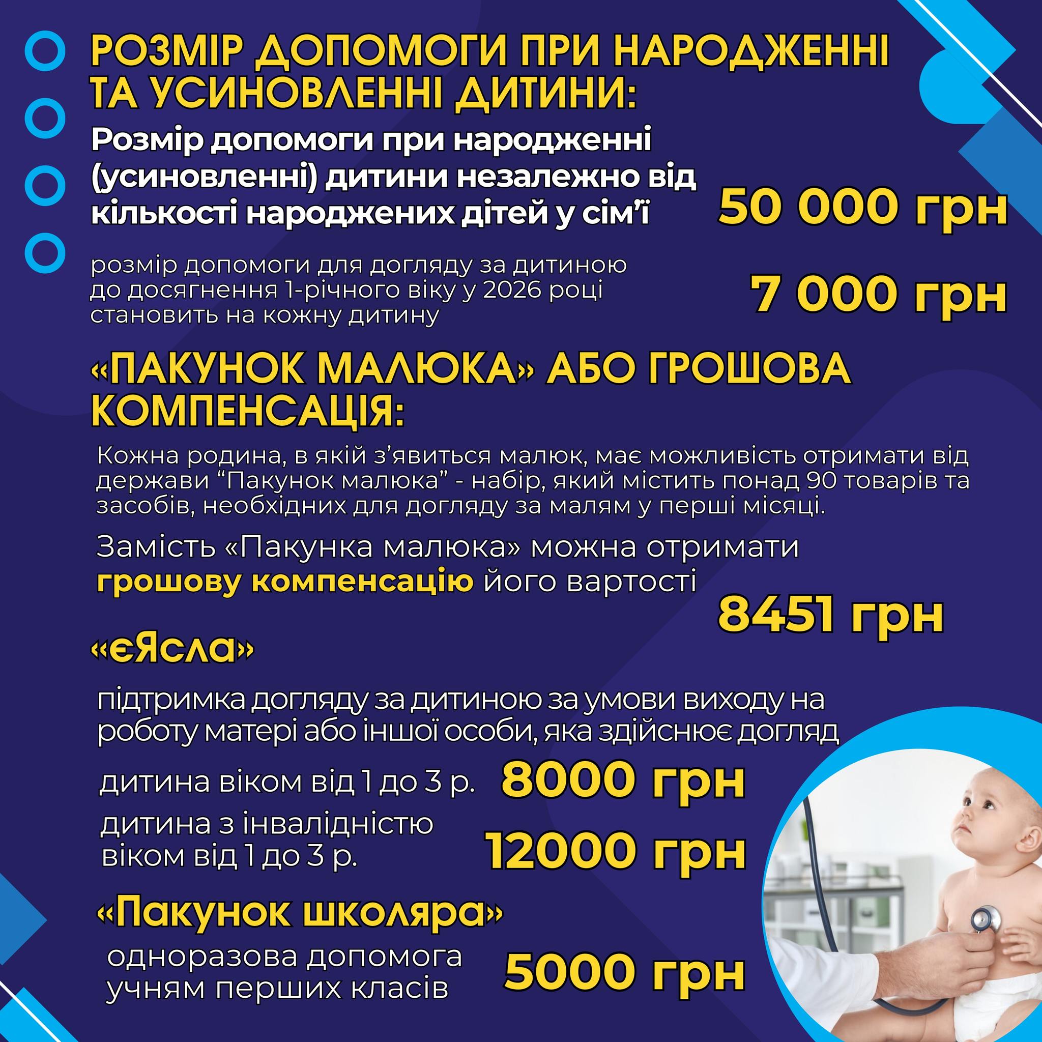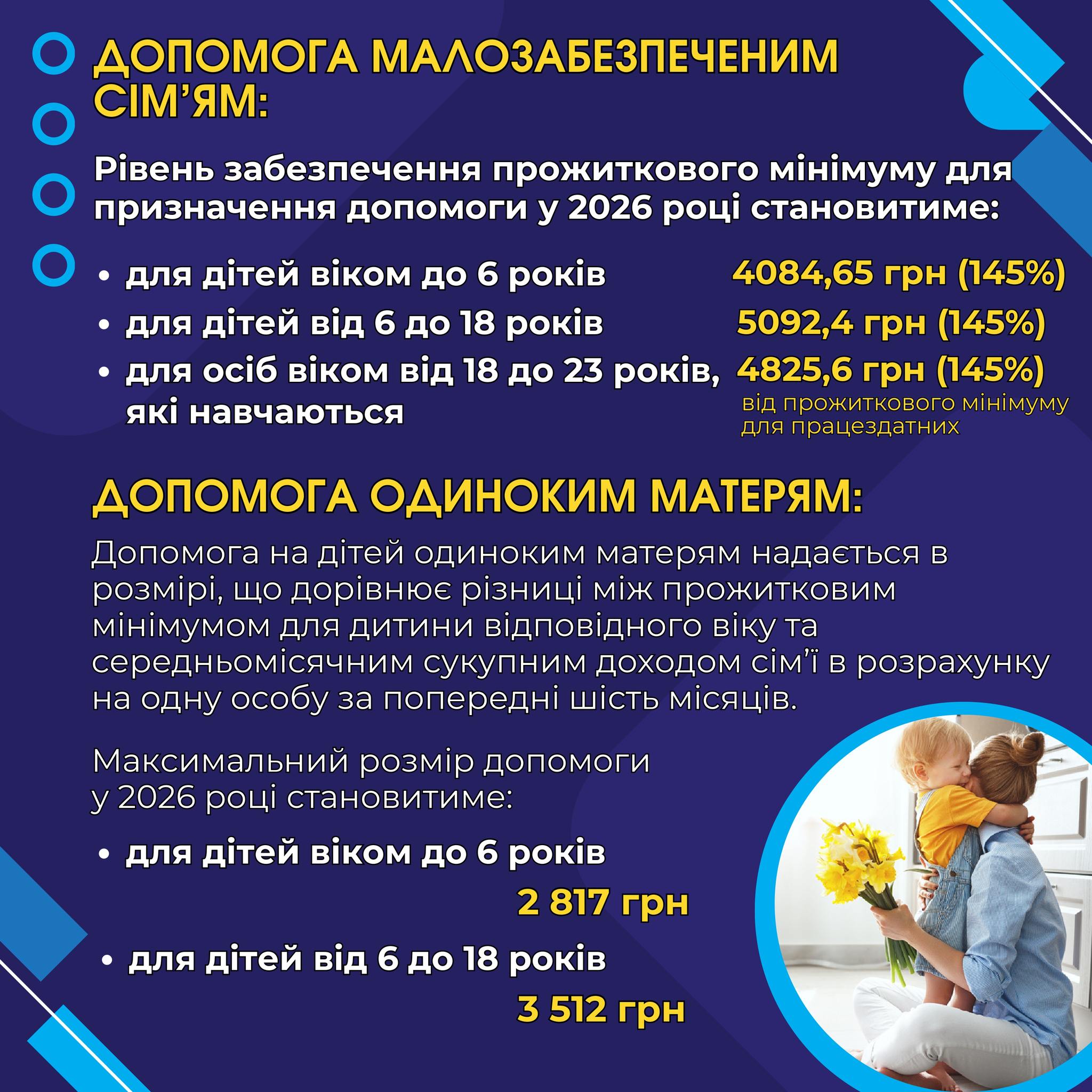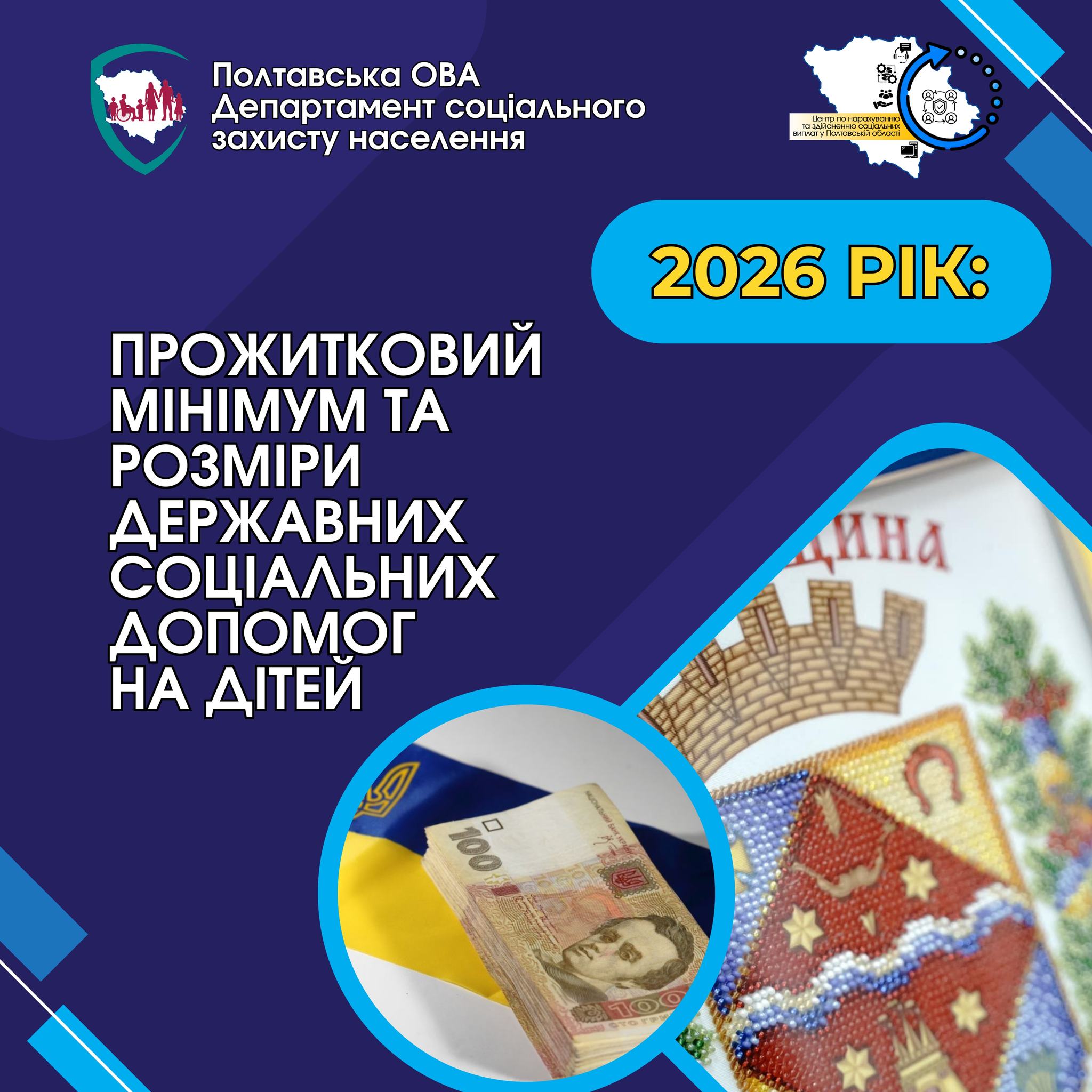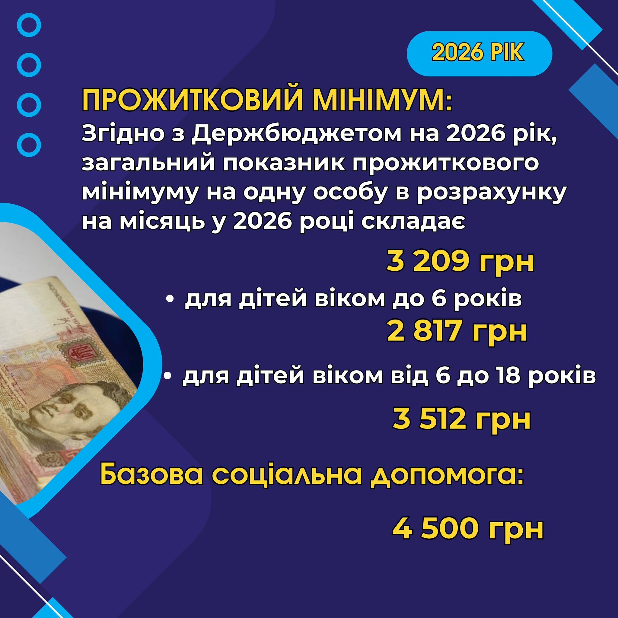 Відповідно до Закону України “Про Державний бюджет на 2026 рік” встановлено, загальний показник розмірів прожиткового мінімуму на рівні 3209 грн та мінімальної заробітної плати встановлено на рівні 8647 грн.