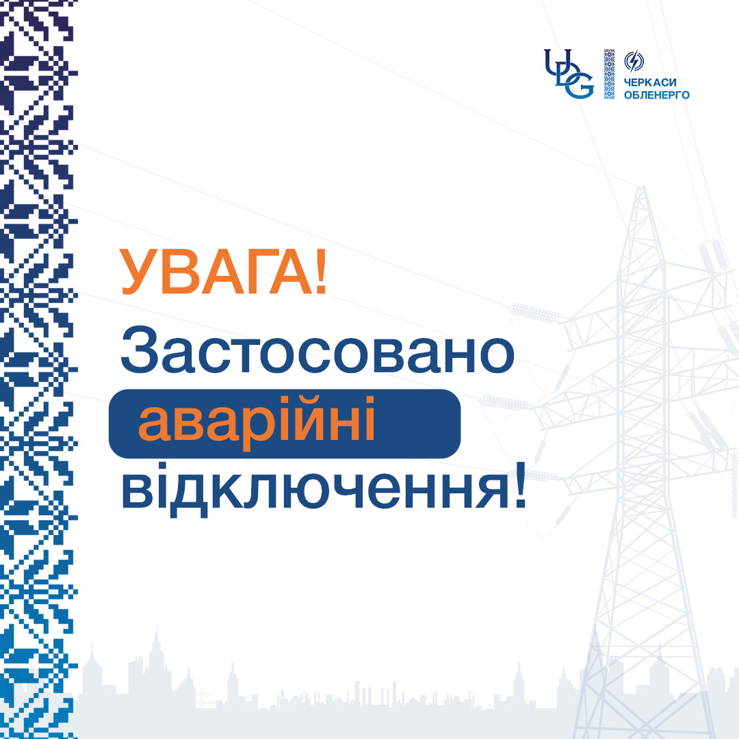 Відповідно до команди НЕК “Укренерго” по Черкаській області 20 січня з 13:35 застосовані графіки аварійних відключень (ГАВ) та спеціальні графіки аварійних відключень (СГАВ) в повному обсязі. Також продовжують діяти графіки погодинних відключень (ГПВ).
