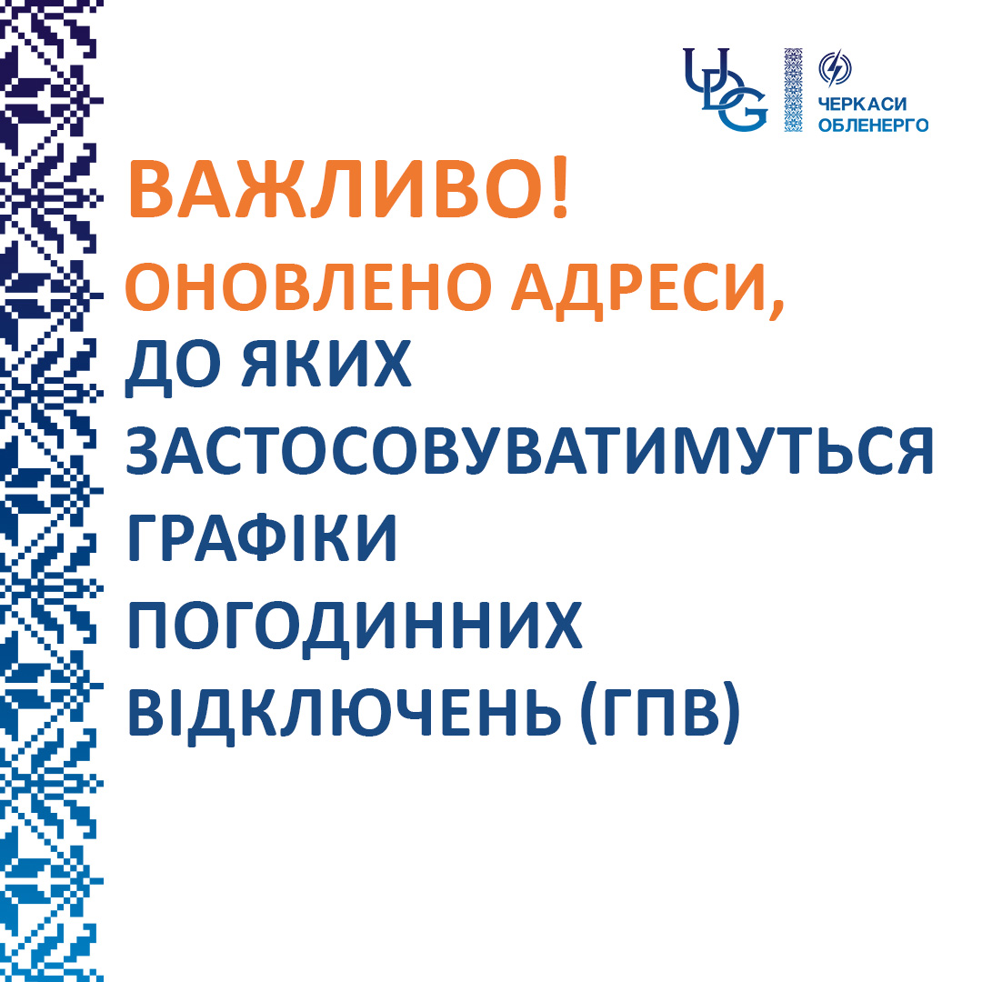 Відповідно до постанови Кабінету Міністрів України «Про внесення змін до Порядку визначення та застосування граничних величин споживання електричної потужності» від 24 грудня 2025 р. № 1744 Черкаська обласна військова адміністрація у співпраці з фахівцями АТ «ЧЕРКАСИОБЛЕНЕРГО» переглянула перелік об’єктів критичної інфраструктури на території Черкаської області. На підставі оновленого переліку АТ «ЧЕРКАСИОБЛЕНЕРГО» сформувало оновлені графіки погодинних відключень електроенергії.