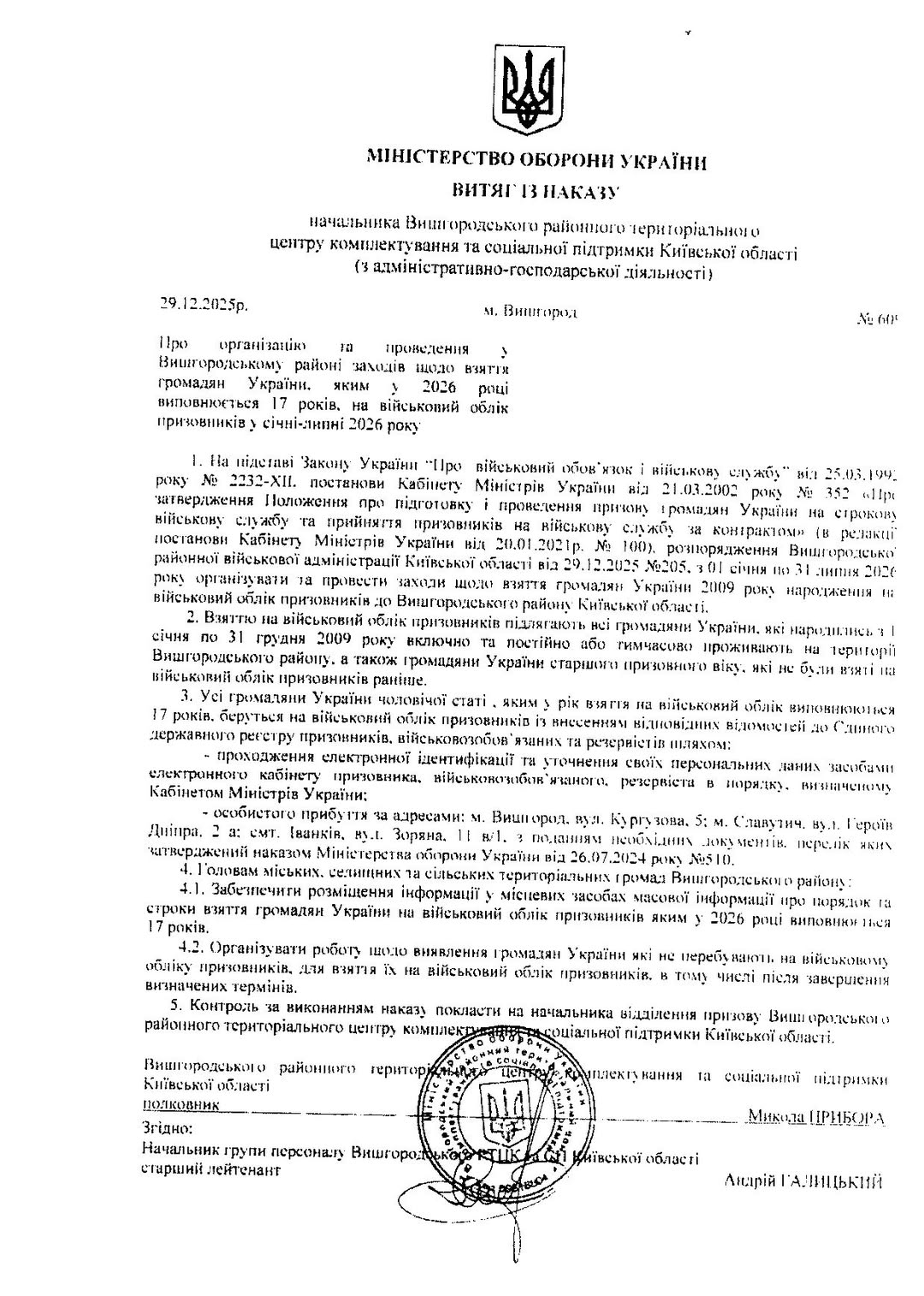 Відповідно до чинного законодавства та наказу начальника Вишгородського районного територіального центру комплектування та соціальної підтримки Київської області: