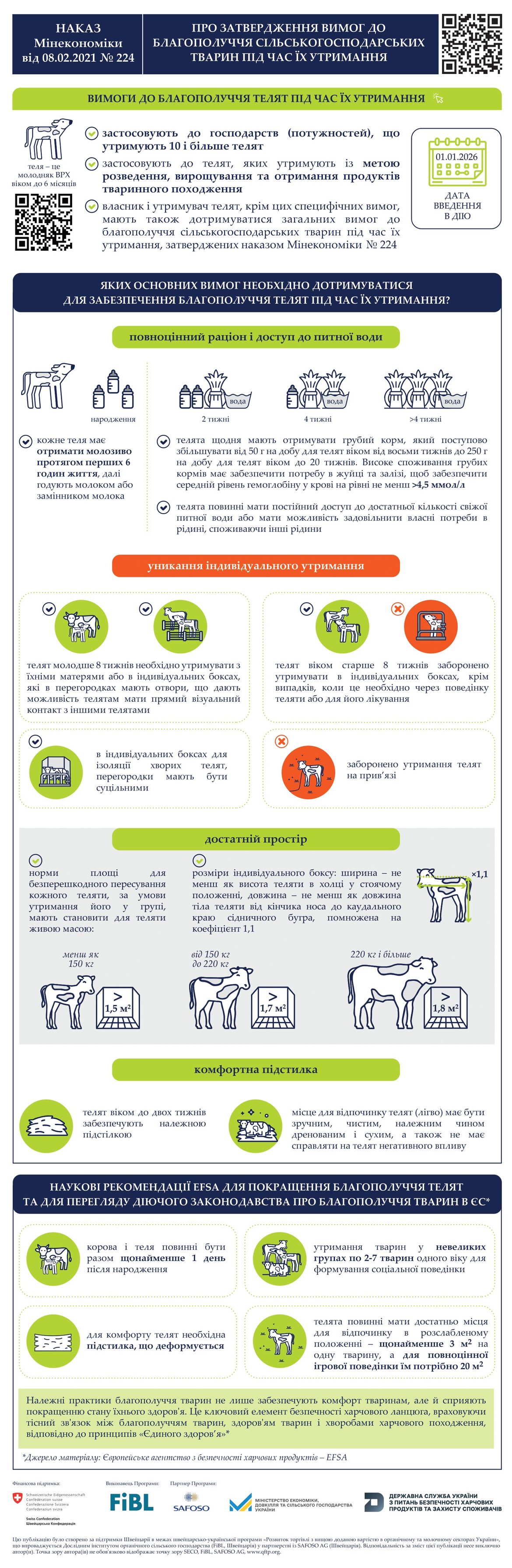 За підтримки Швейцарії, в межах швейцарсько-української програми «Розвиток торгівлі з вищою доданою вартістю в органічному та молочному секторах України» (Quality FOOD Trade Program), що впроваджується Дослідним інститутом органічного сільського господарства (FiBL,Швейцарія) у партнерстві з SAFOSO AG (Швейцарія), Міністерством економіки, довкілля та сільського господарства України та Держпродспоживслужби створено інфографіку, в якій висвітлені вимоги до благополуччя телят під час їх утримання.