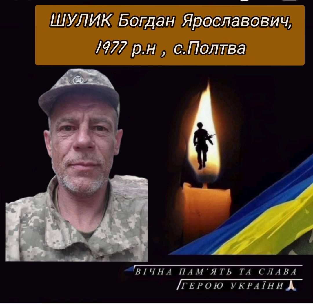 😭З болем у серці сповіщаємо сумну звістку про втрату нашого земляка — солдата ШУЛИКА Богдана Ярославовича, 1977 року народження, мешканця села Полтва.