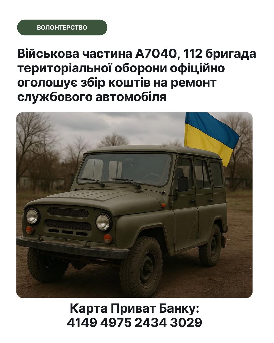 ✍️Військова частина А7040, 112 бригада територіальної оборони офіційно оголошує збір коштів на ремонт службового автомобіля, який щодня використовується для виконання бойових завдань на Павлоградському напрямку.