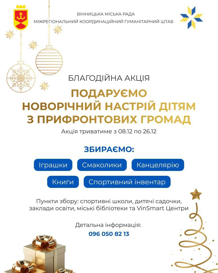 Вінницька міська рада та Міжрегіональний координаційний гуманітарний штаб запрошують вінничан долучитися до благодійної акції зі збору подарунків для дітей із Балаклії та інших прифронтових територій