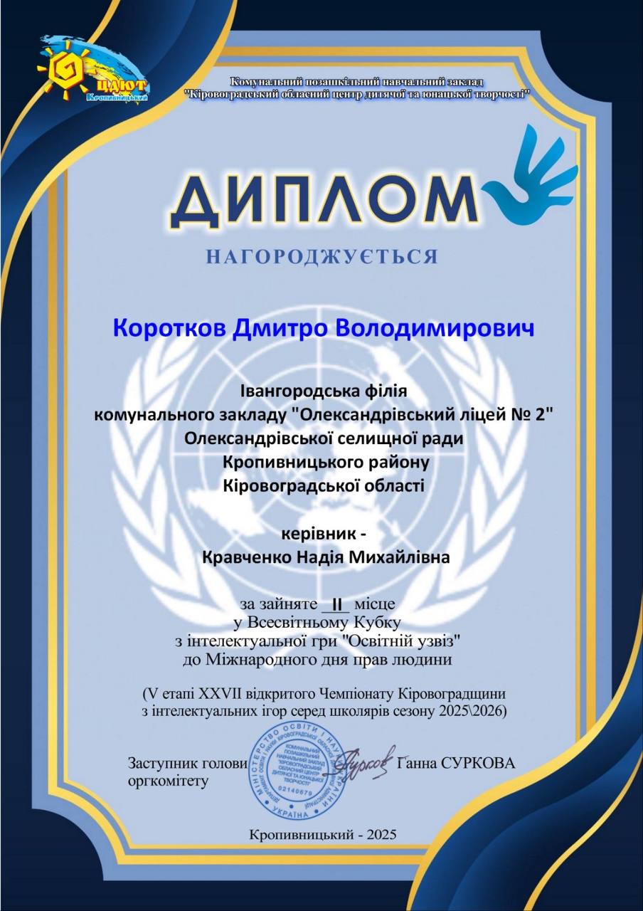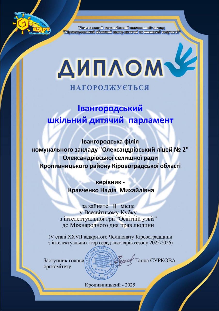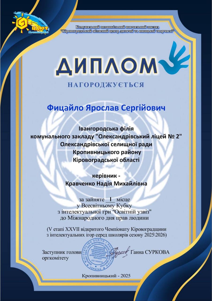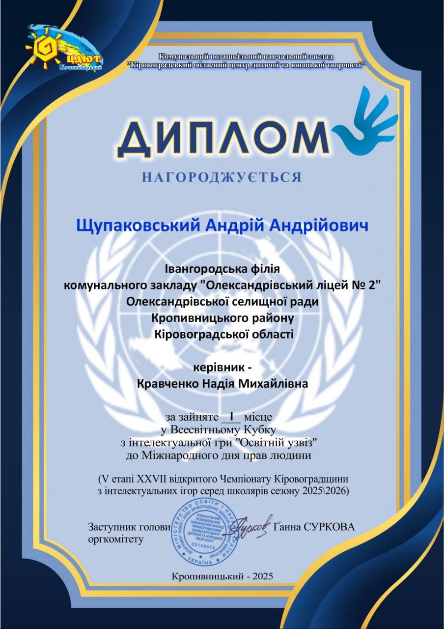 Підведені підсумки Всесвітнього Кубку з інтелектуальної гри «Освітній узвіз» до Міжнародного дня прав людини (V етап XХVІІ відкритого Чемпіонату Кіровоградської області з інтелектуальних ігор серед школярів сезону 2025-2026).