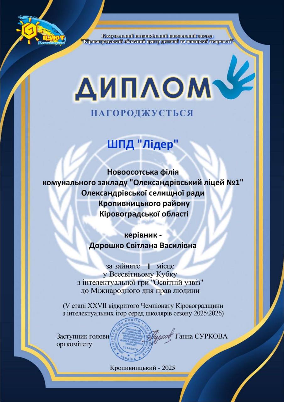 ШПД «Лідер» Новоосотської філії КЗ «Олександрівський ліцей №1» (керівник Дорошко С.В.);