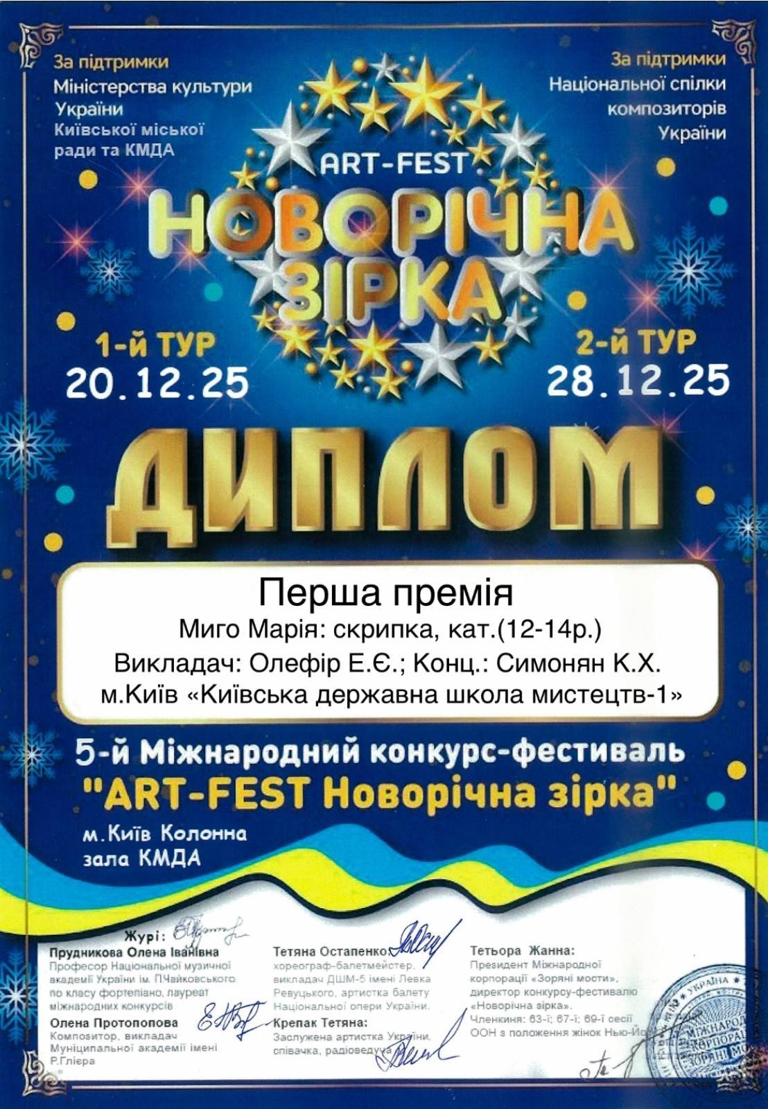 5-й Міжнародний конкурс-фестиваль мистецтв “Art fest – Новорічна зірка” – І місце 🥇