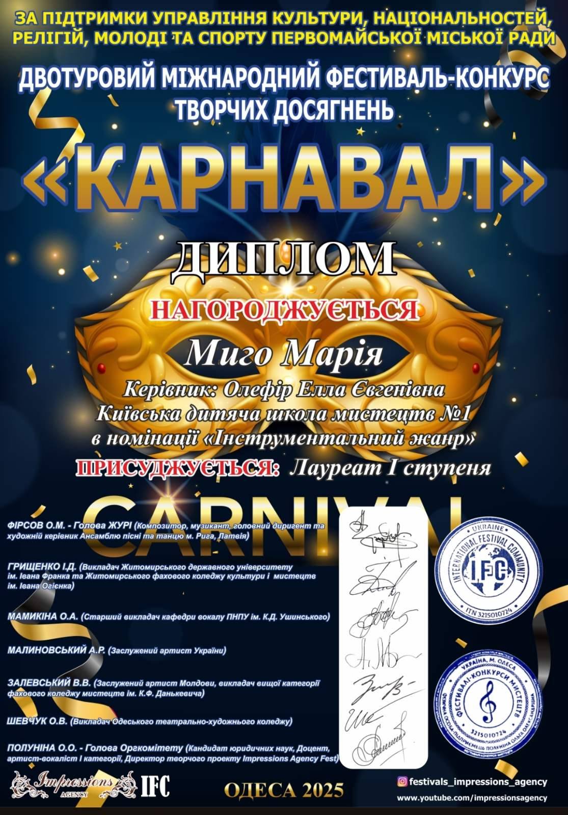 Двотуровий міжнародний фестиваль-конкурс творчих досягнень “Карнавал” – І місце 🥇