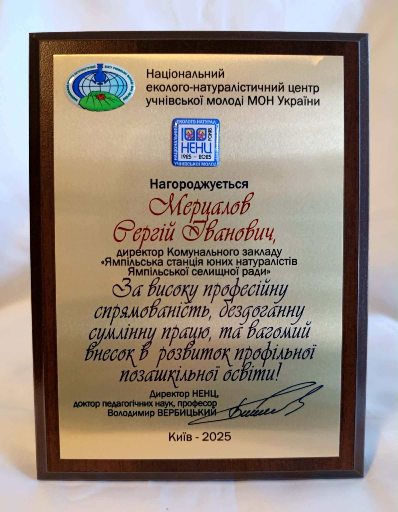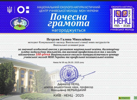 З нагоди відзначення 100-річчя Національного еколого-натуралістичного центру учнівської молоді МОН України та профільної позашкільної освіти, за значний особистий внесок у розвиток національної освіти, багаторічну плідну педагогічну діяльність та високий професіоналізм відзначено подяками Національного еколого-натуралістичного центру учнівської молоді МОН України педагогів комунального закладу Ямпільська станція юних натуралістів Ямпільської селищної ради: директора Мерцалова Сергія Івановича та методиста Петруню Галину Миколаївну.