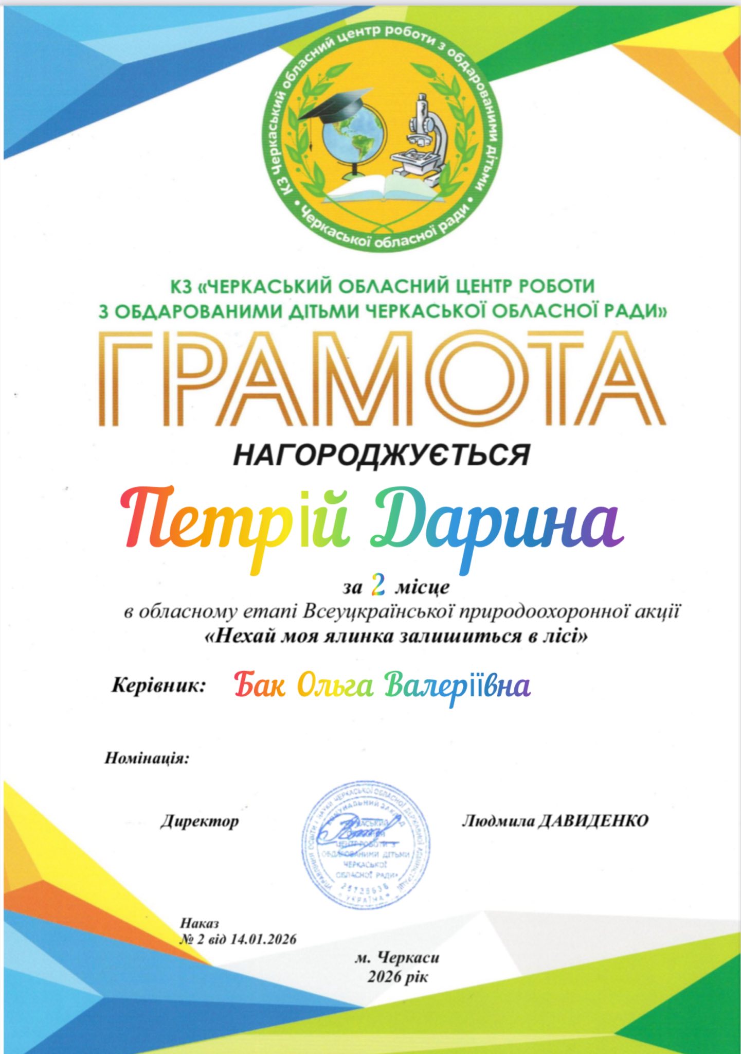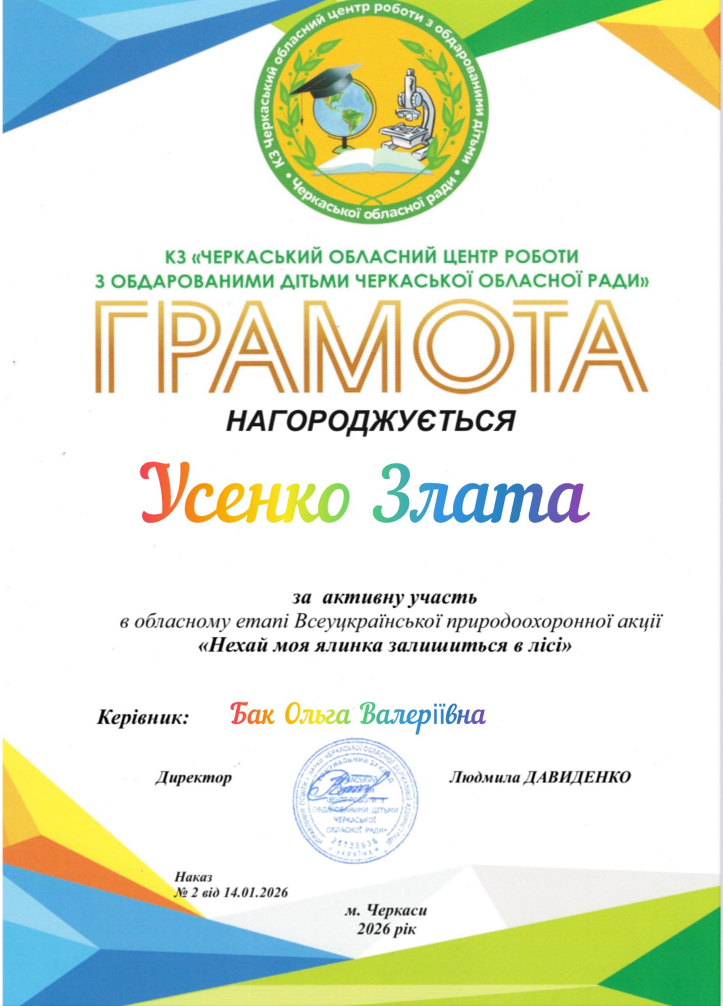 Щиро радіємо успіхам і з гордістю вітаємо Петрій Дарину, яка здобула 🥈 ІІ місце, та Усенко Злату, нагороджену грамотою за активну участь в обласному етапі Всеукраїнської природоохоронної акції