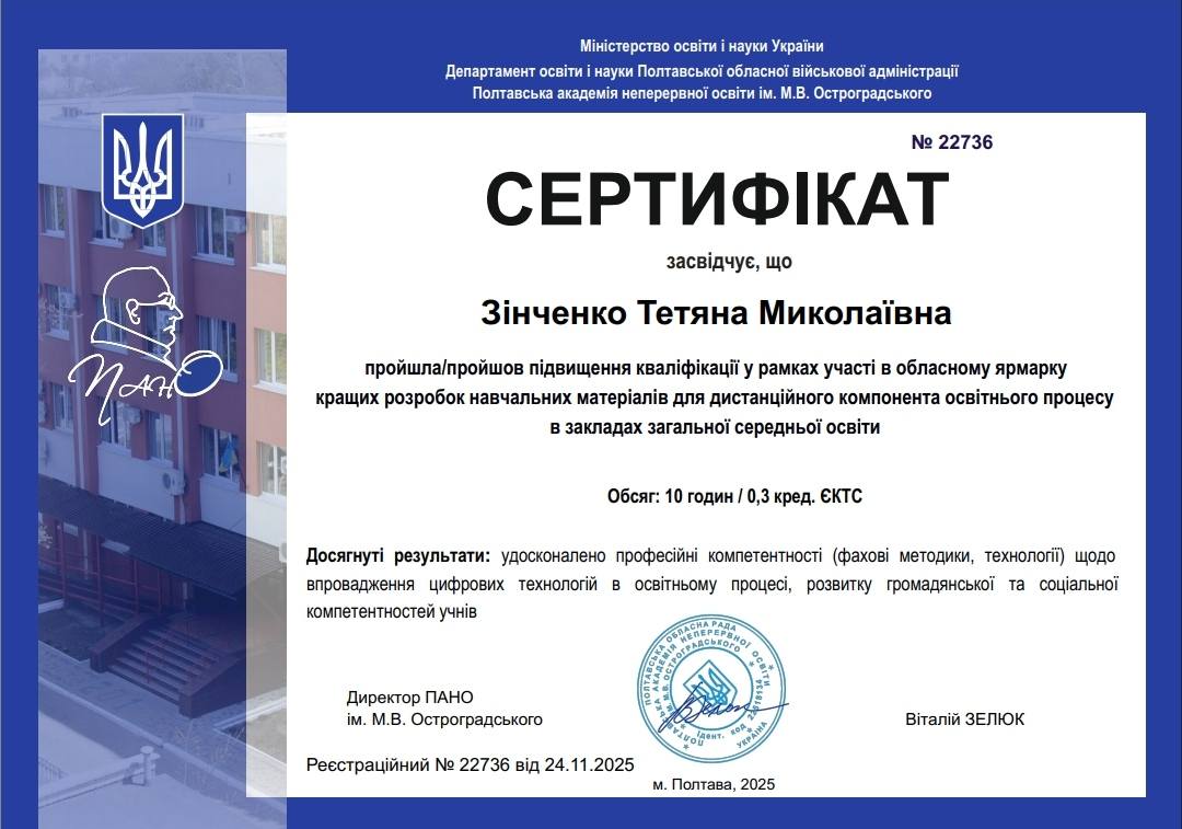 Висловлюємо щиру вдячність Полтавській академії неперервної освіти за високу оцінку професійного досвіду та результатів роботи Тетяни Зінченко.