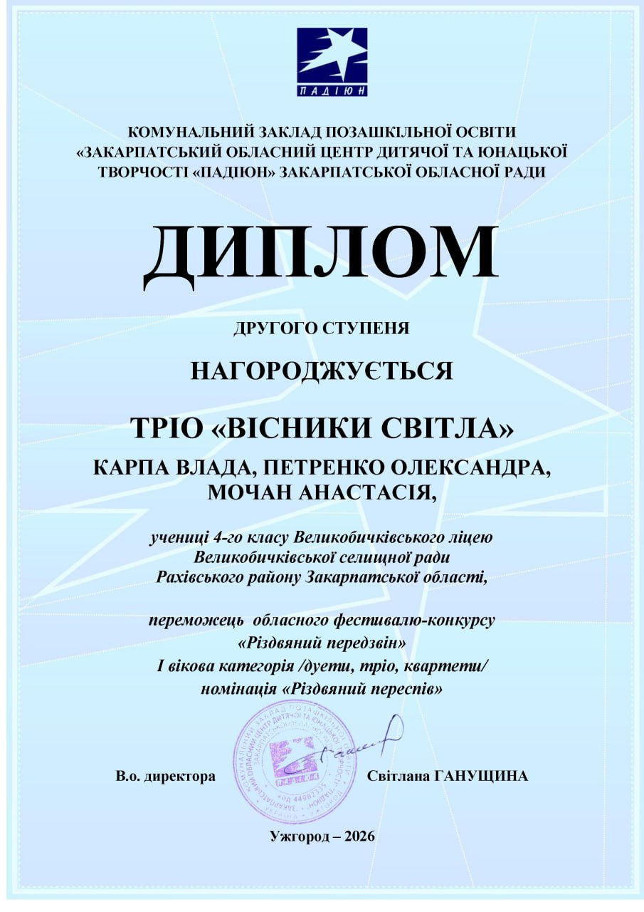ІІ місце – тріо «Вісники світла»: Карпа Влада, Петренко Олександра, Мочан Анастасія, учениці 4-го класу Великобичківського ліцею;