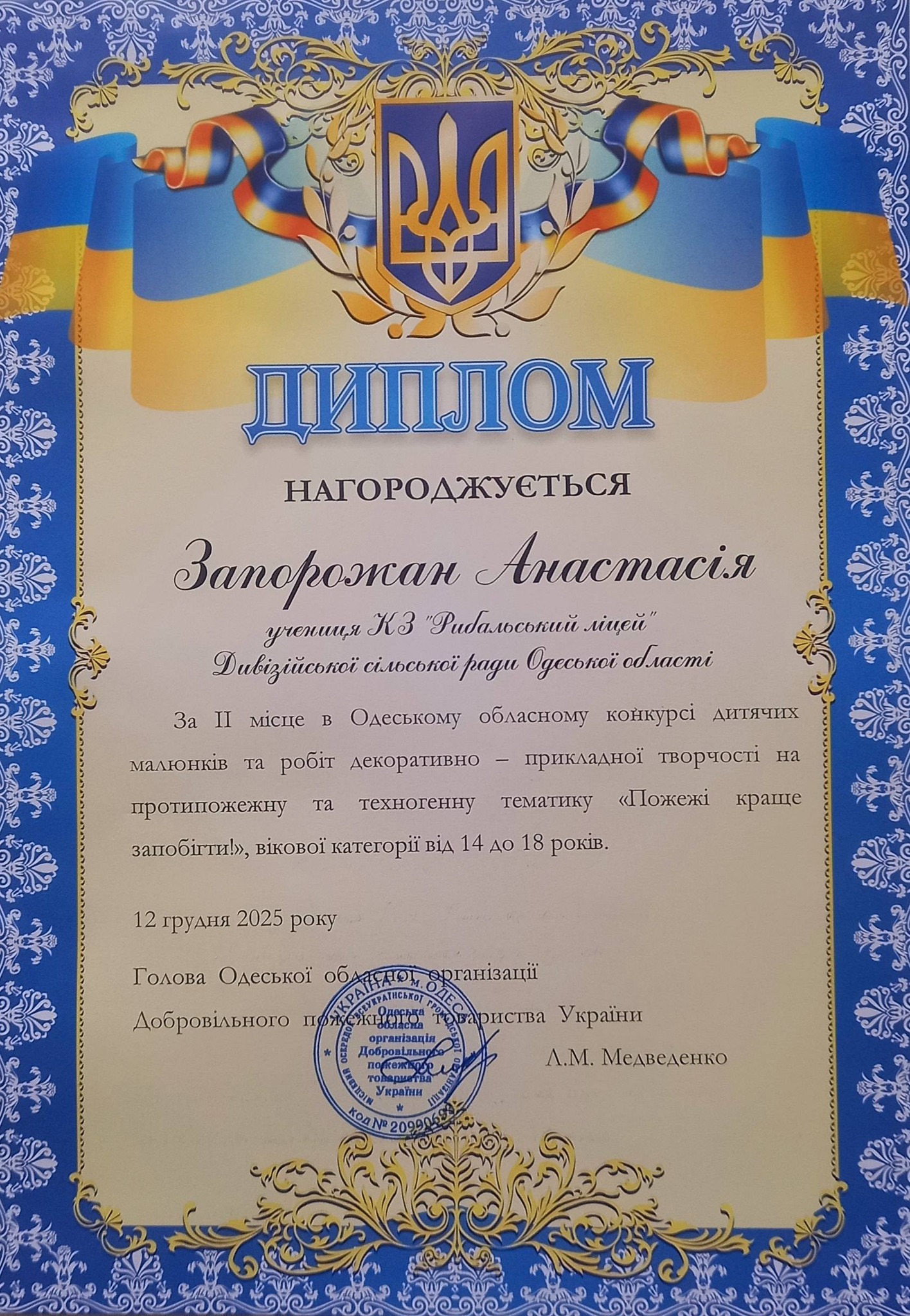 Учениця 9 класу Запорожан Анастасія Іванівна взяла участь в Одеському обласному конкурсі дитячих малюнків та робіт декоративно-прикладної творчості на протипожежну та техногенну тематику🧯🚒 «Пожежі краще запобігти!»🧯🚒 та за результатами оцінювання журі посіла ІІ місце.