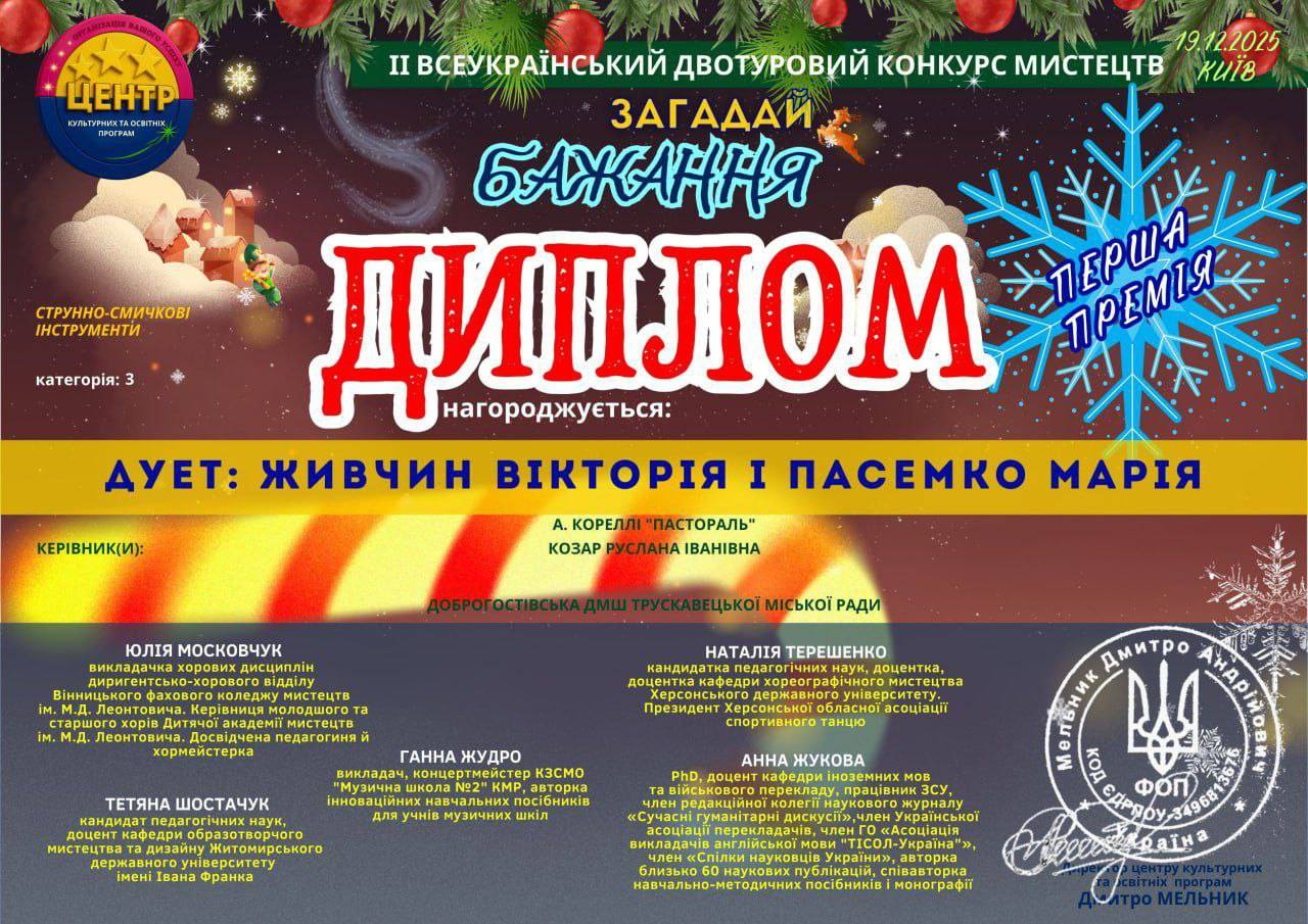 Вітаємо учениць Доброгостівської ДМШ Живчин Вікторію та Пасемко Марію (дует) з отриманням Диплома Першої Премії на ІІ Всеукраїнському двотуровому конкурсі мистецтв “ЗАГАДАЙ БАЖАННЯ”.
