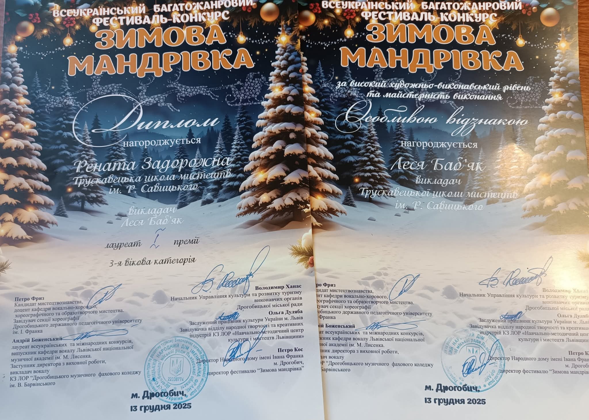 🥇Вітаємо ученицю Трускавецької школи мистецтв імені Романа Савицького Ренату Задорожну зі здобуттям l премії на Всеукраїнському багатожанровому фестивалі-конкурсі “Зимова мандрівка”м.Дрогобич (офлайн) та її викладачку Баб’як Л.В., котра отримала від журі “Особливу відзнаку” ✨