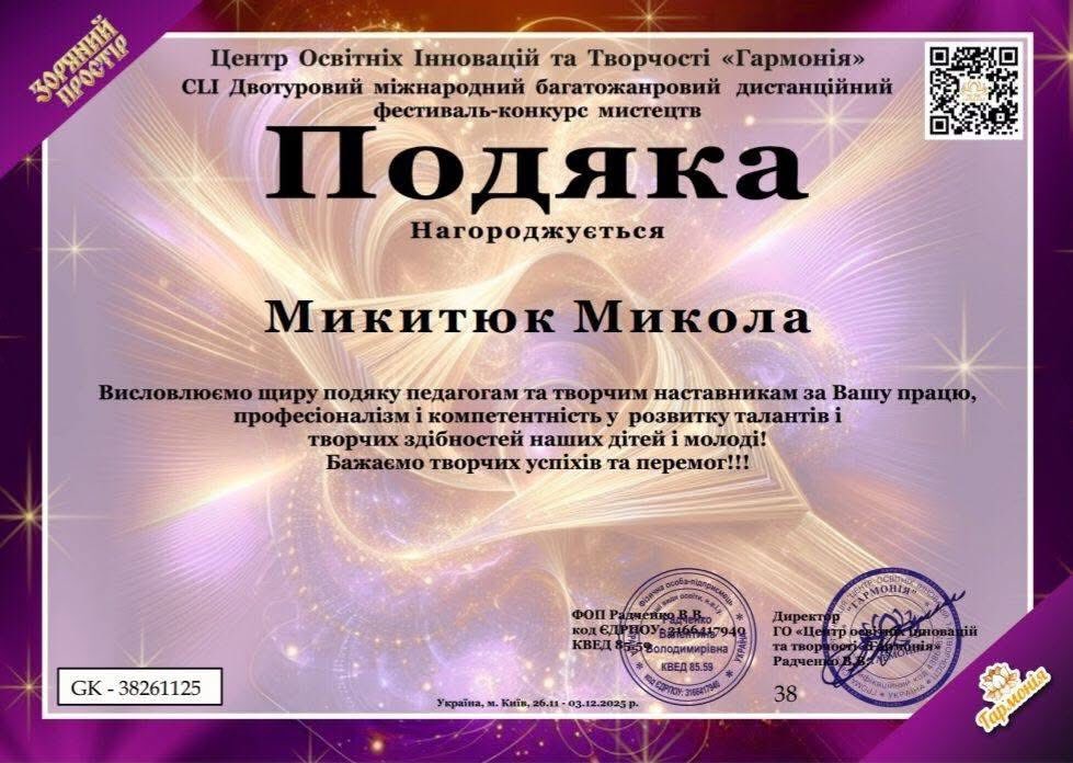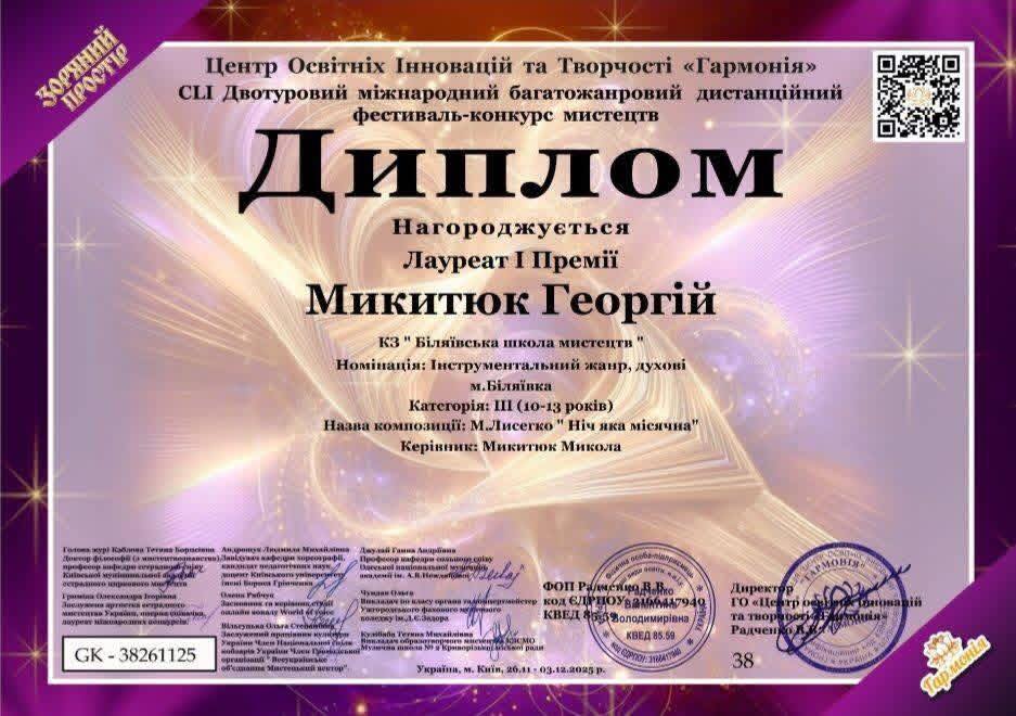 Вітаємо учня класу духових інструментів (труба) Микитюка Георгія КЗ «Біляївська школа мистецтв» Біляївської міської ради з першим місцем у Міжнародному фестивалі-конкурсі мистецтв «Зоряний простір» м.Київ (викладач Микитюк Микола).