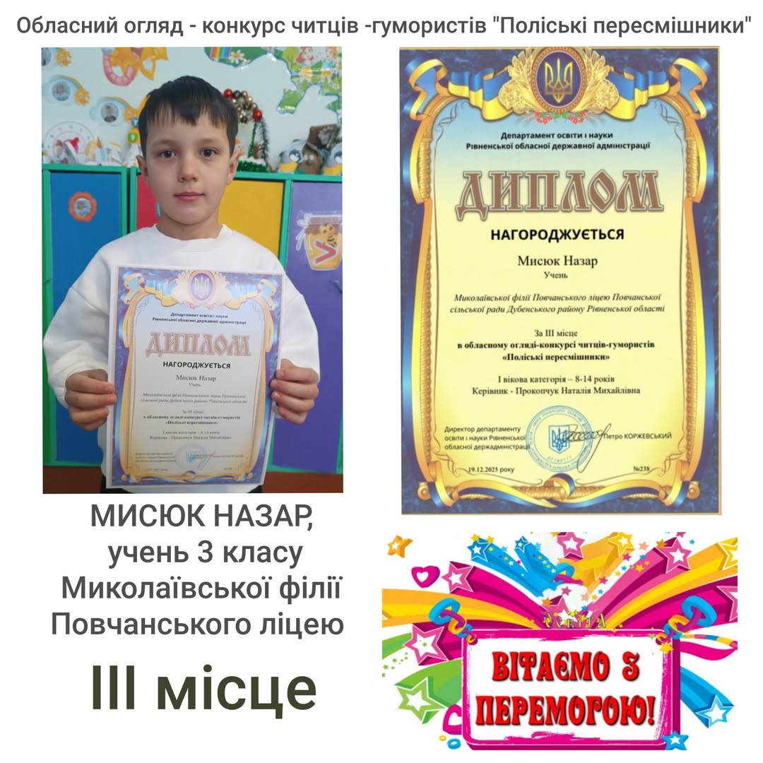 🥉Вітаємо Мисюка Назара, учня 3 класу Миколаївської філії Повчанського ліцею, з зайнятим ІІІ місцем у І віковій категорії (8-14 років), вчитель Прокопчук Наталія Михайлівна.