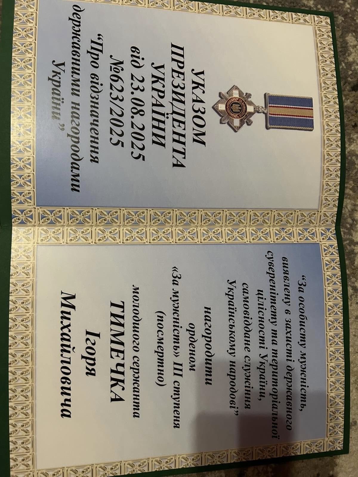 Державну нагороду присвоєно, посмертно, рідним полеглого Захисника з селища Гусятин Тимечка Ігоря Михайловича.