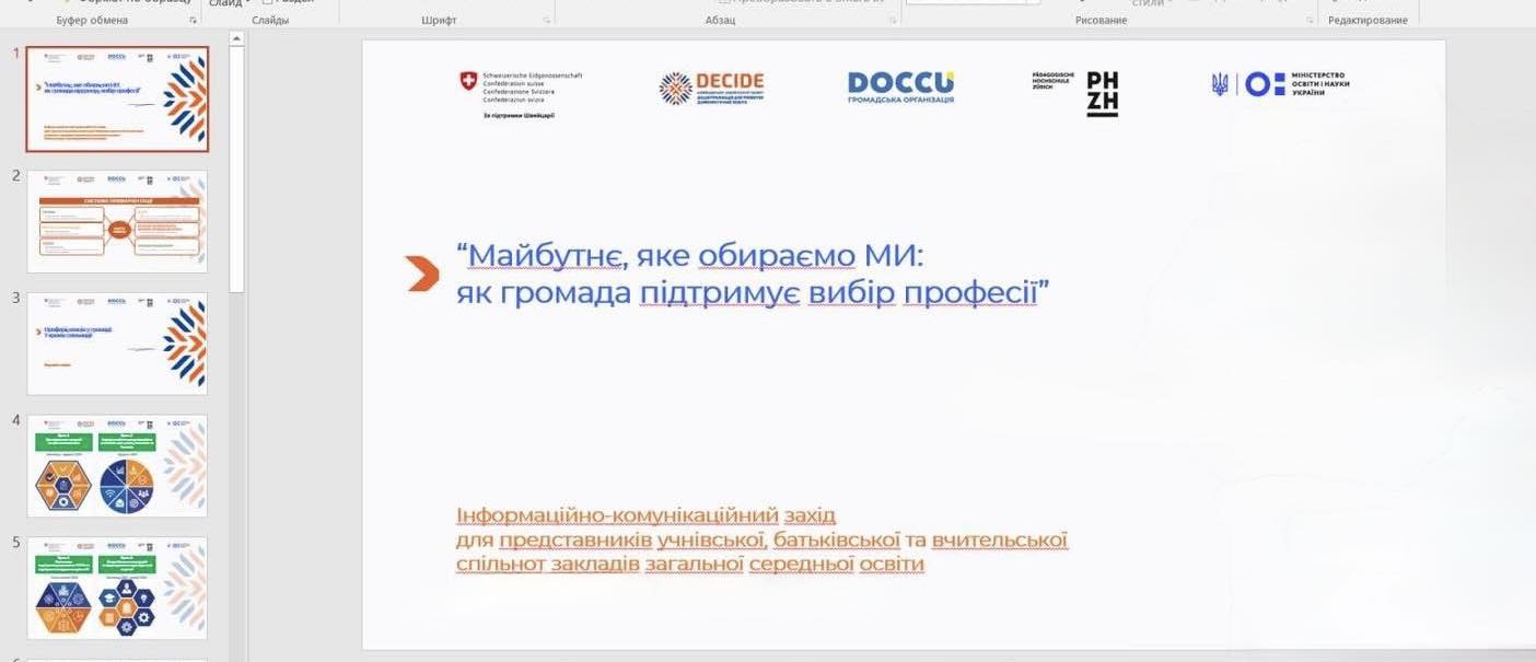 Захід організовано у рамках Швейцарсько-українського проєкту DECIDE –«Децентралізація для розвитку демократичної освіти», що реалізується ГО DOCCU у партнерстві з Цюрихським педагогічним університетом (Швейцарія) за підтримки Швейцарського бюро співробітництва в Україні.