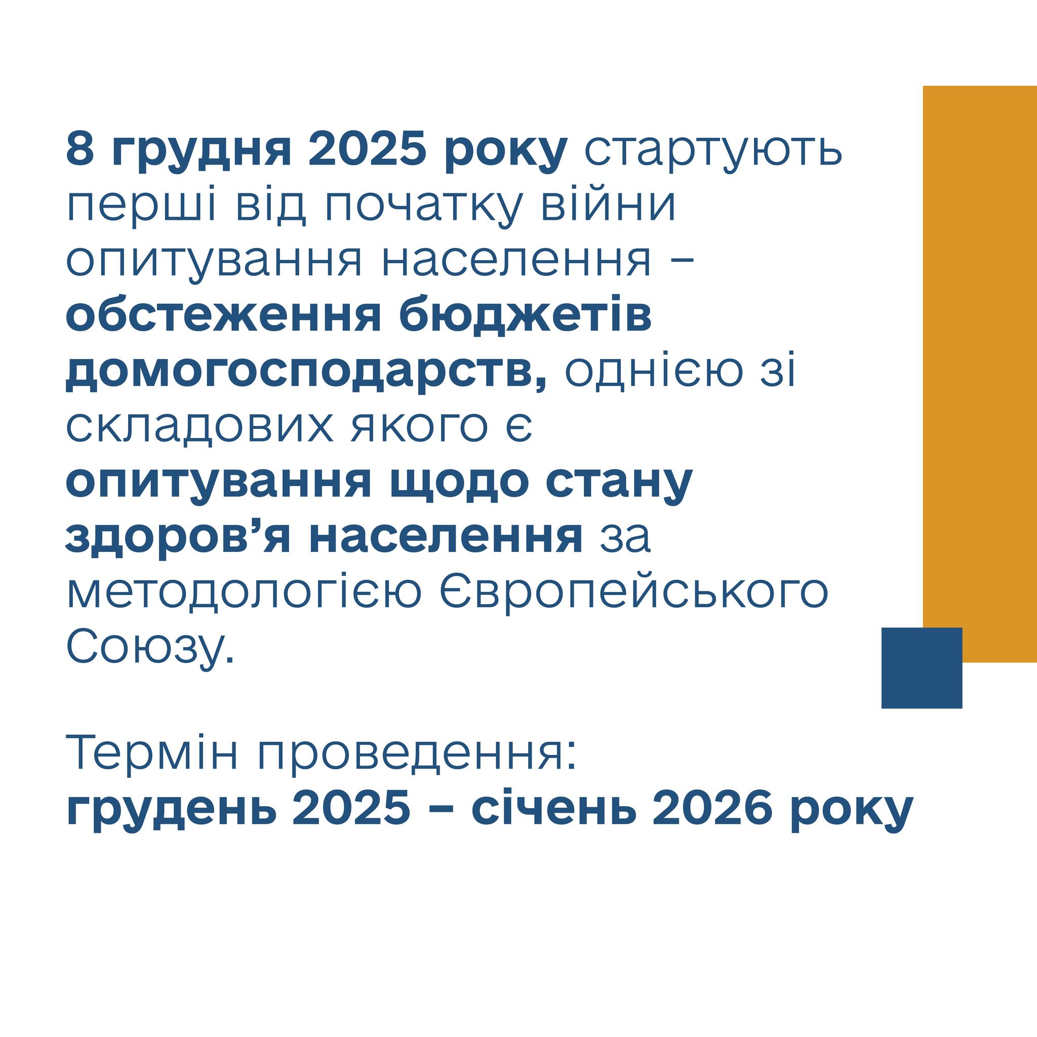 Із 8 грудня 2025 року Держстат запускає перші від початку повномасштабної війни опитування населення – обстеження бюджетів домогосподарств, однією зі складових якого є опитування щодо стану здоров’я населення за методологією Європейського Союзу.