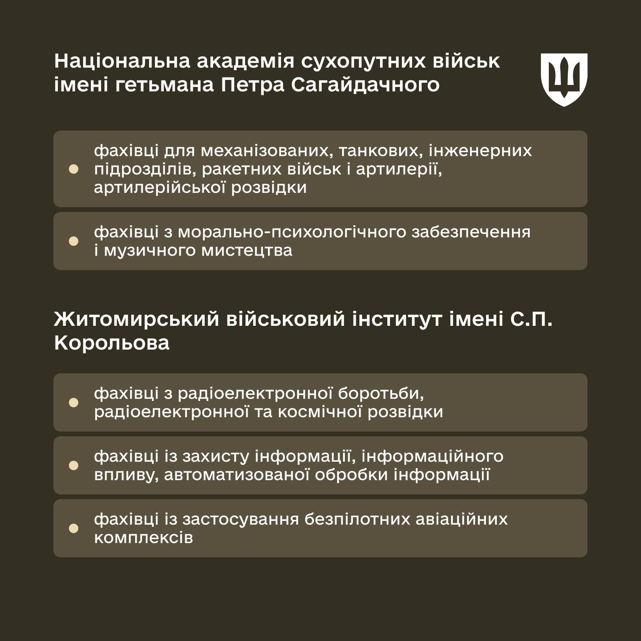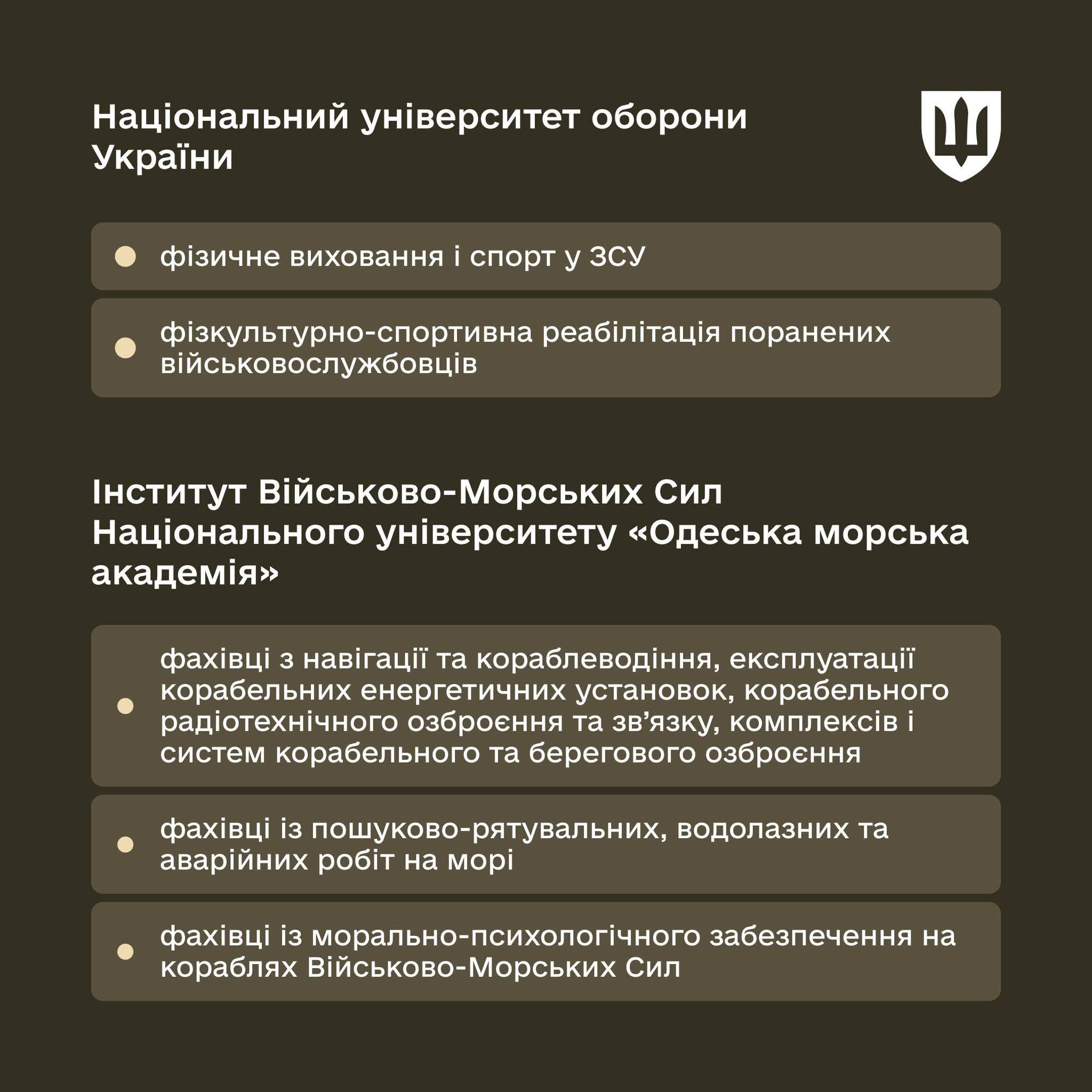 Міністерство оборони нагадує, за якими спеціальностями здійснюється підготовка курсантів у ВВНЗ.