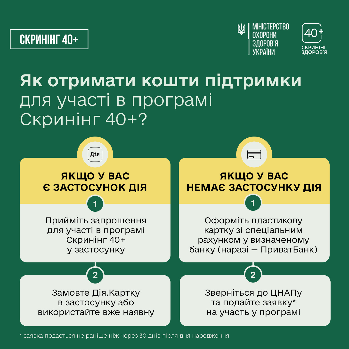 1️⃣ Запрошення на скринінг надходитиме в застосунок Дія на 30-й день після дня народження — для людей віком від 40 років і більше.