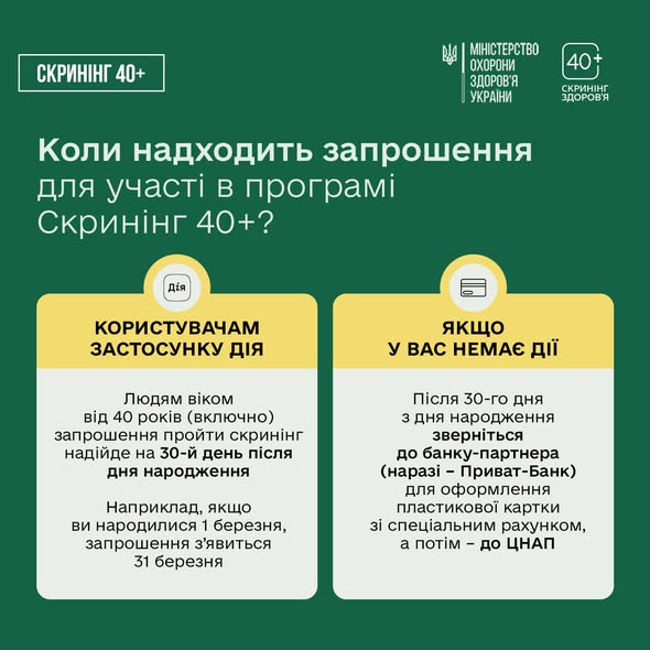 1️⃣ Запрошення на скринінг надходитиме в застосунок Дія на 30-й день після дня народження — для людей віком від 40 років і більше.