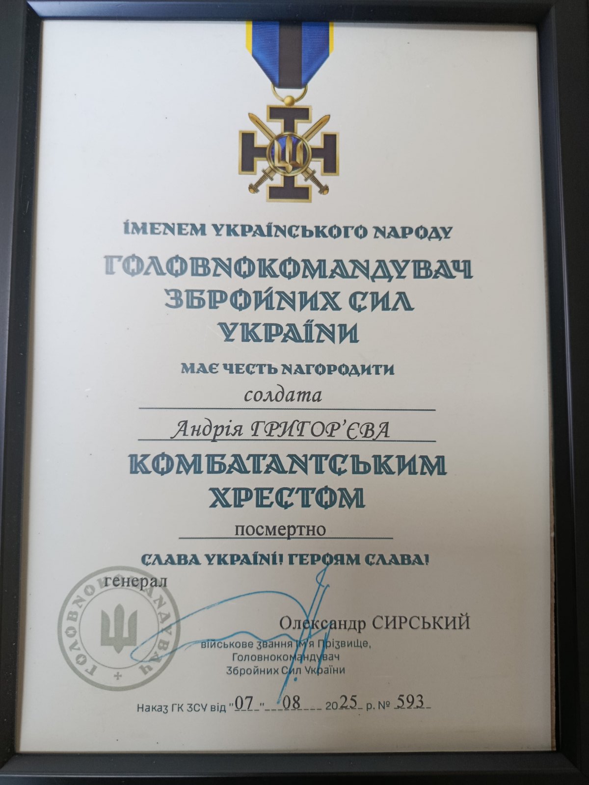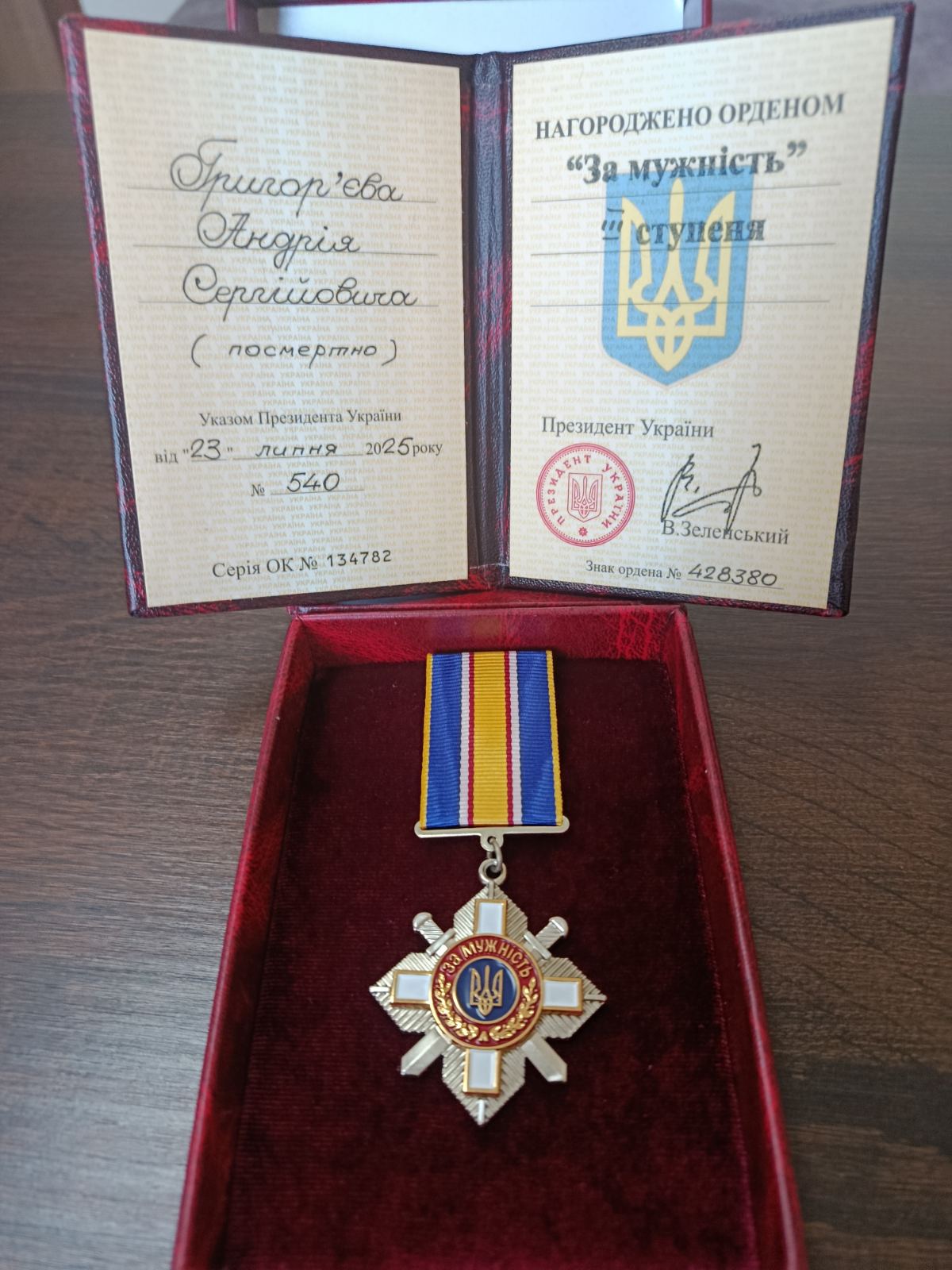 В кінці 2025 року матері загиблого Захисника України Григор’єва Андрія Сергійовича було передано державну нагороду – орден «За мужність» III ступеня. Ця державна нагорода України, якою відзначають військовослужбовців за героїзм і мужність, виявлені при порятунку людей чи при виконанні військового обов’язку в умовах ризику для життя.