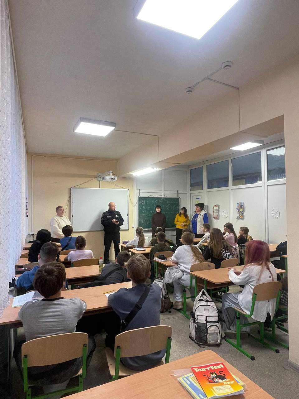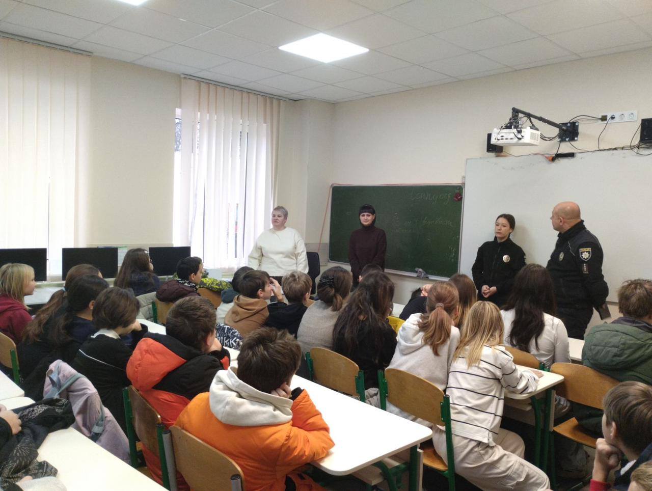 Поліцейський офіцер громади Андрій Нагорний та інспектор сектору ювенальної превенції Фастівського РУП поспілкувались з учнями та пояснили важливість гідної поведінки, взаємодопомоги та підтримки в шкільному колективі.