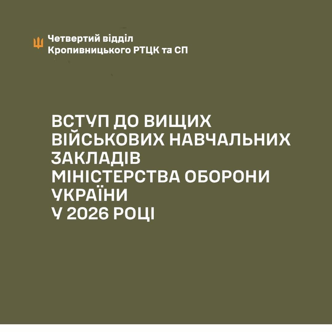 В період з 01 січня до 01 червня 2026 року проходить вступна кампанія до вищих військових навчальних закладів Міністерства оборони України та військових навчальних підрозділів закладів вищої освіти держави громадяни України з числа цивільної молоді, військовослужбовців, резервістів та військовозобов’язаних, які мають повну загальну середню, професійну, професійно-технічну, фахову передвищу або вищу освіту віком від 17 до 30 років, у тому числі ті, яким 17 років виповнюється в рік початку військової служби (навчання) та які не мають військових звань офіцерського складу.