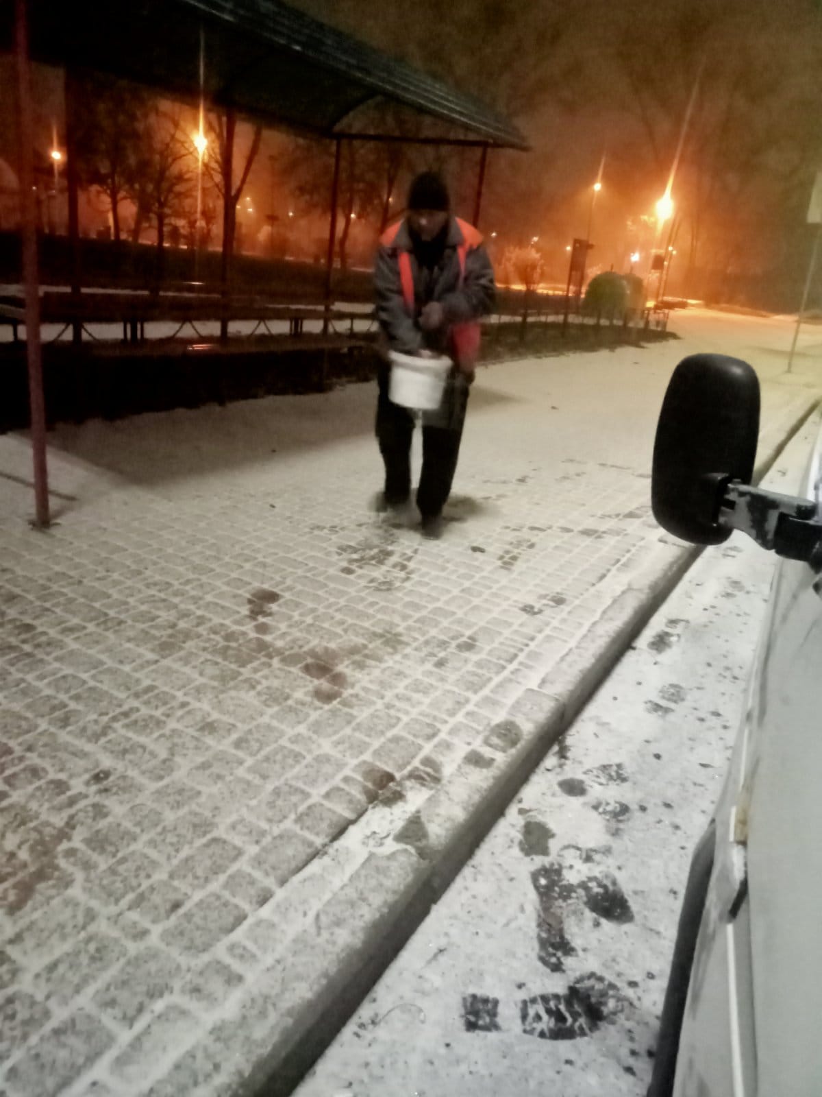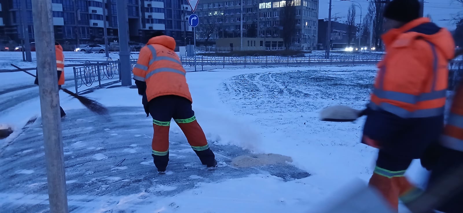🔰Бригадами з ручного прибирання районного автодору здійснюється обробка протиожеледними засобами зупинок, вузьких тротуарів, сходів, “острівців безпеки”, пішохідних переходів.