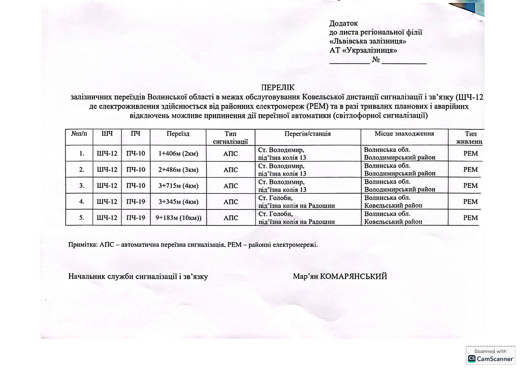 З метою забезпечення безпеки руху на залізничних переїздах та недопущення дорожньо-транспортних пригод в умовах планових і аварійних відключень електроживлення районних електромереж просимо Вас через органи місцевого самоврядування інформувати водіїв автотранспортних засобів про особливу пильність при русі через залізничні переїзди.