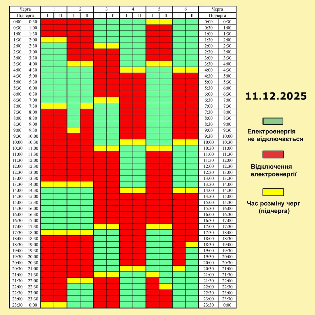 За командою НЕК “Укренерго”, 11 грудня діятиме такий Графік погодинних відключень (ГПВ) ☝️.