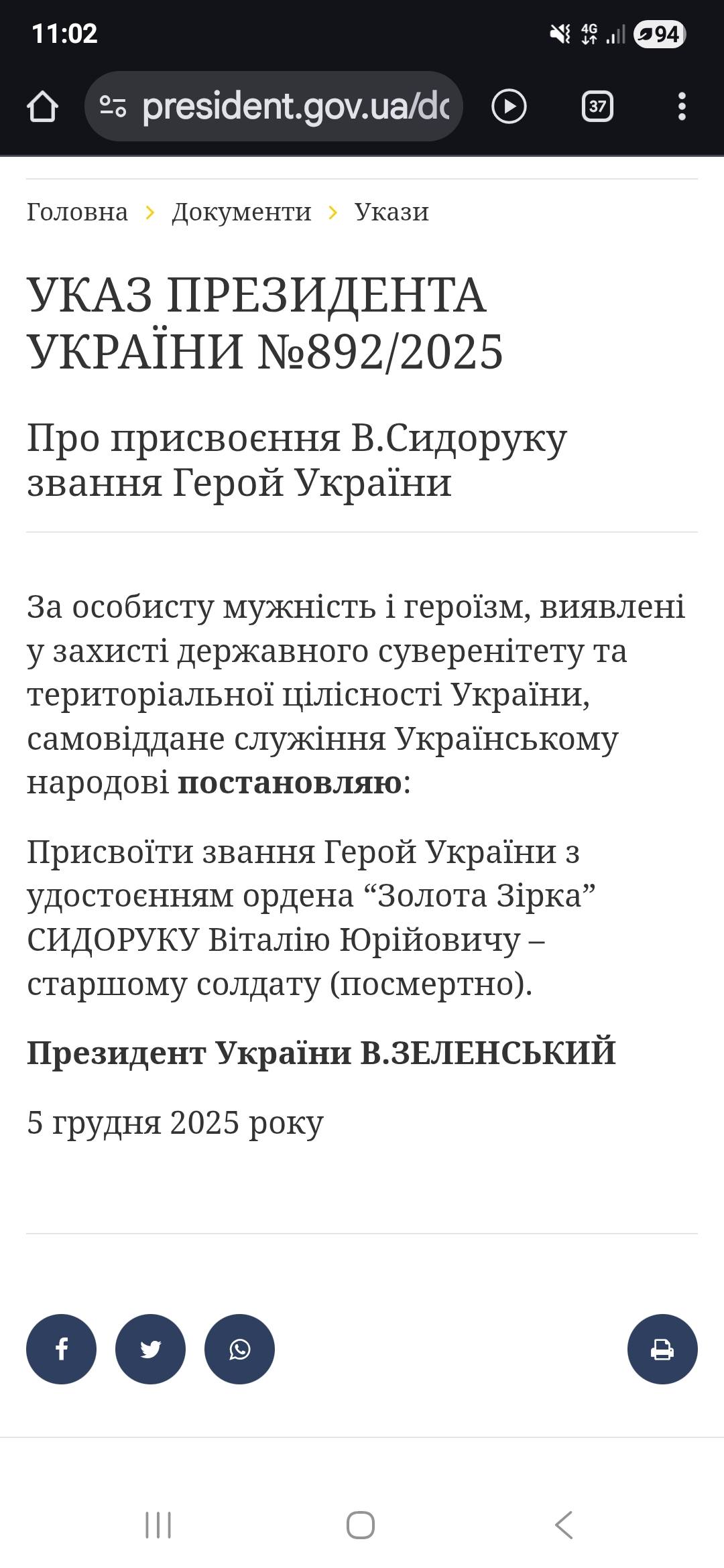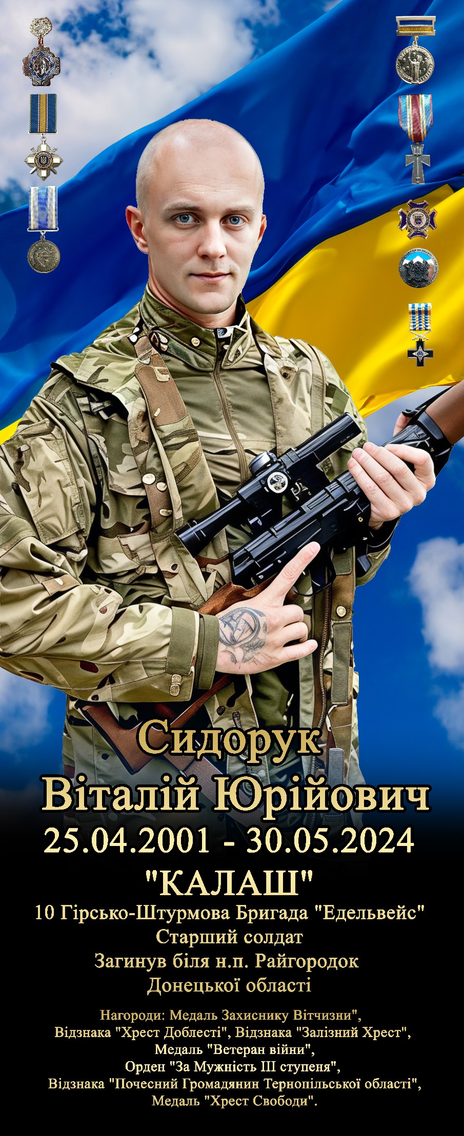 Указом Президента України від 5 грудня наш Син, Віталій Сидорук удостоєний почесного звання Герой України з врученням Ордену “Золота зірка”, посмертно..