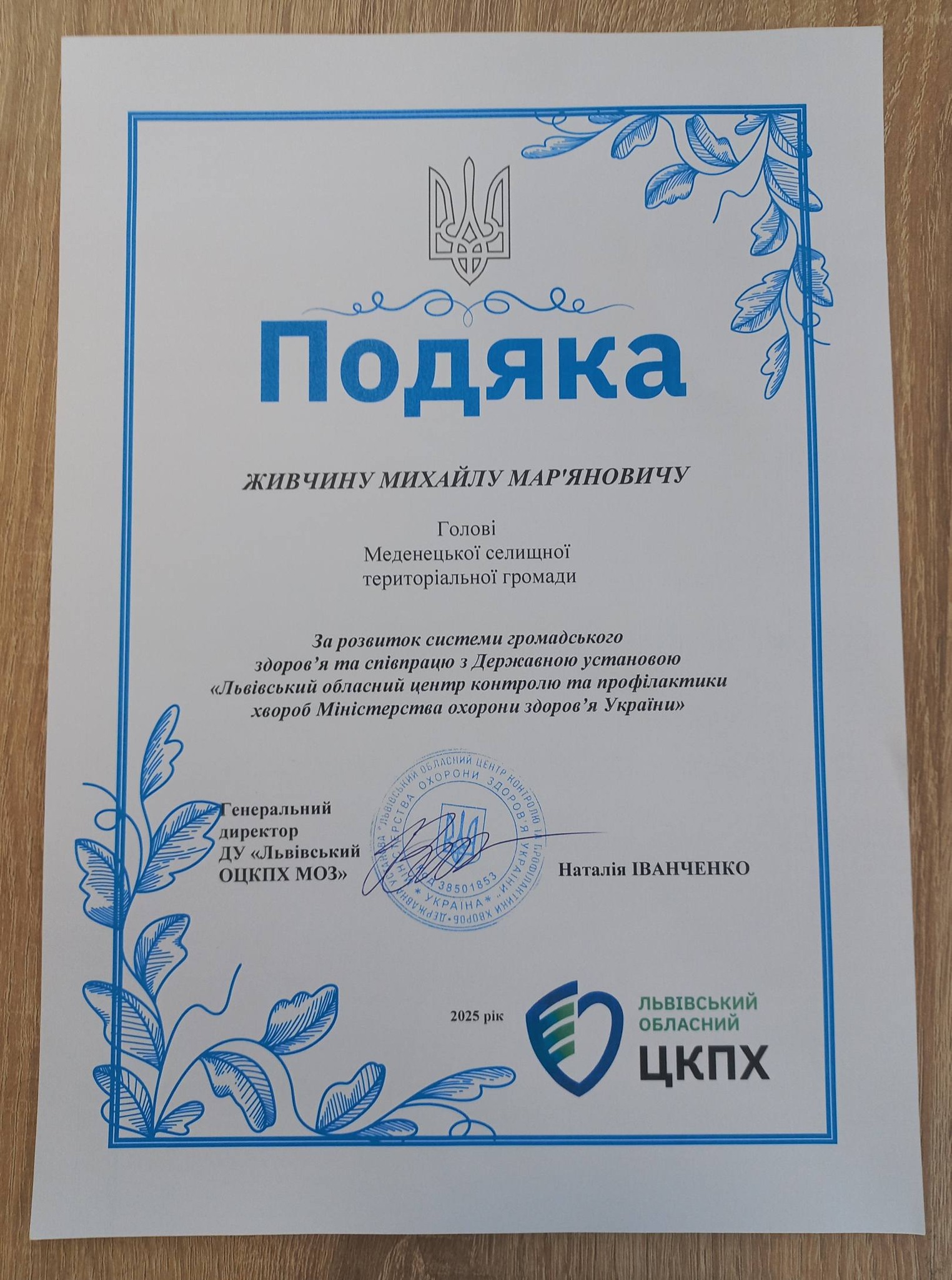 У ході зустрічі Леся Денека вручила голові громади Михайлові Живчину Подяку від ДУ «Львівський обласний центр контролю та профілактики хворіб МОЗ України» за вагомий внесок у розвиток системи громадського здоров’я на території Меденицької громади.