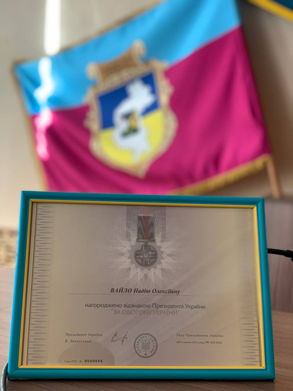 Голова Сумської обласної державної адміністрації Олег Григоров вручив очільниці нашої громади Вайло Надії Олексіївні відзнаку Президента «За оборону України».