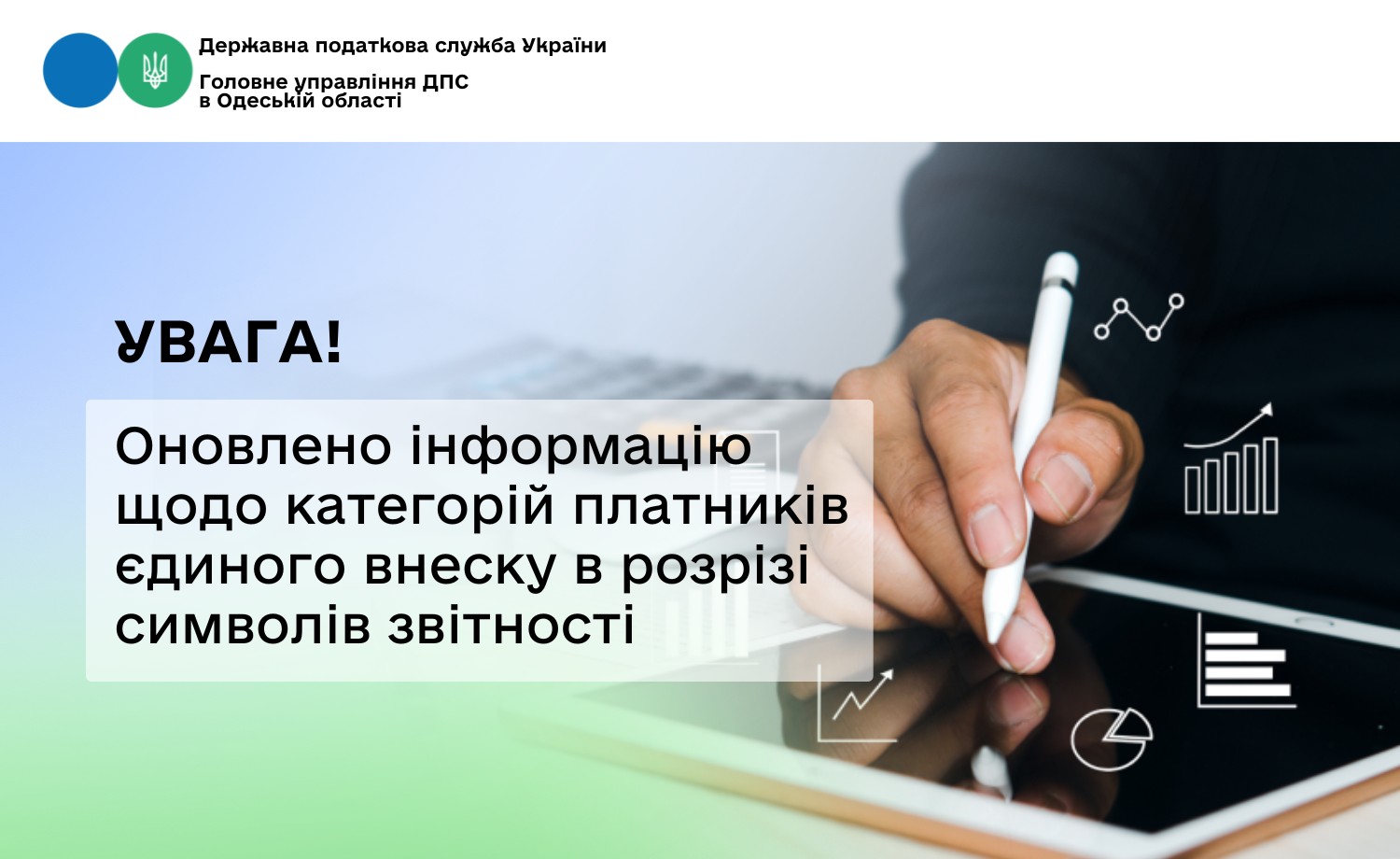 Головне управління ДПС в Одеській області повідомляє, з метою уточнення символів звітності, за якими необхідно сплачувати єдиний внесок, у «Реквізитах рахунків для сплати єдиного внеску на загальнообов’язкове державне соціальне страхування» оновлено інформацію щодо категорій платників єдиного внеску в розрізі символів звітності відповідно до чинної редакції постанови Кабінету Міністрів України від 26 листопада 2014 р. № 675 «Про затвердження пропорцій розподілу єдиного внеску на загальнообов’язкове державне соціальне страхування» та з урахуванням наказу Державної казначейської служби України від 08.12.2025 № 301 «Про внесення змін до Довідника відповідності символу звітності пропорціям розподілу єдиного внеску на загальнообов’язкове державне соціальне страхування».