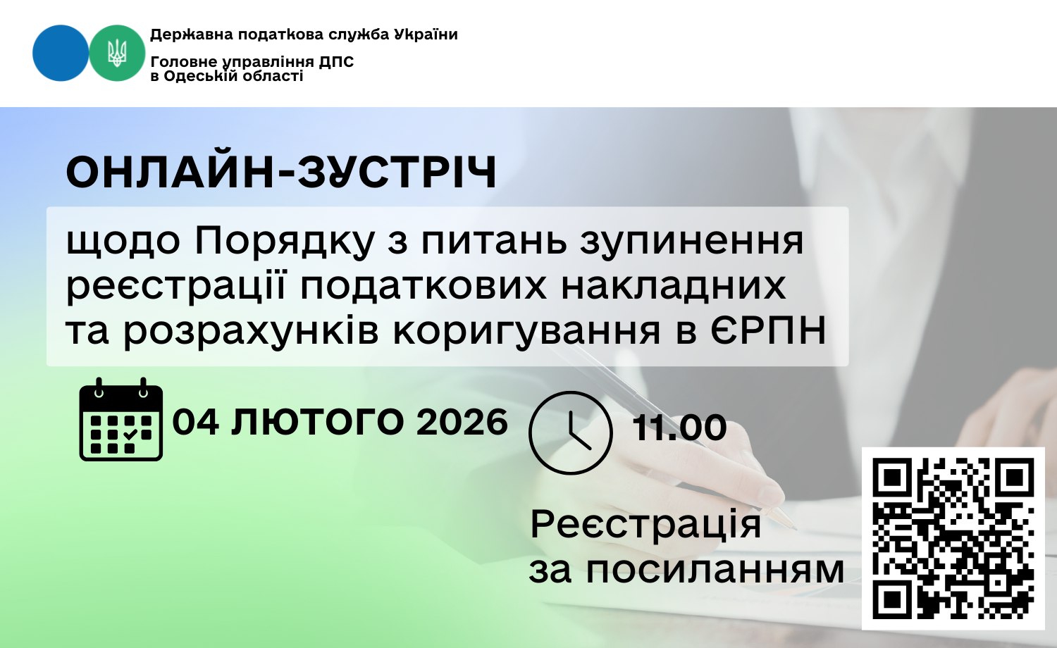 Головне управління ДПС в Одеській області запрошує платників податків регіону взяти участь в онлайн-зустрічі щодо Порядку з питань зупинення реєстрації податкових накладних та розрахунків коригування в ЄРПН, затвердженого постановою КМУ від 11.12.2019 № 1165 (зі змінами та доповненнями).